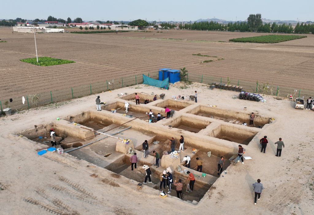 考古队员在隆尧县柏人城遗址第四次考古发掘现场作业(2023年10月8日摄,无人机照片)。新华社记者 牟 宇摄