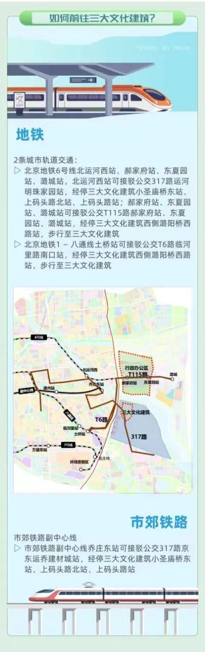 地铁6号线郝家府站、东夏园站、潞城站可换乘公交T115路,经停三大文化建筑西侧潞阳桥西路站。同时,新开8对16条定制公交线路,乘客可通过“定制公交”微信小程序预约乘坐。