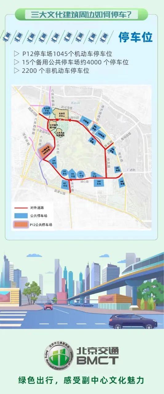如果自驾前往,目前有三大文化建筑周边P12停车场1045个机动车停车位,15个备用公共停车场约4000个停车位,还有2200个非机动车停车位。