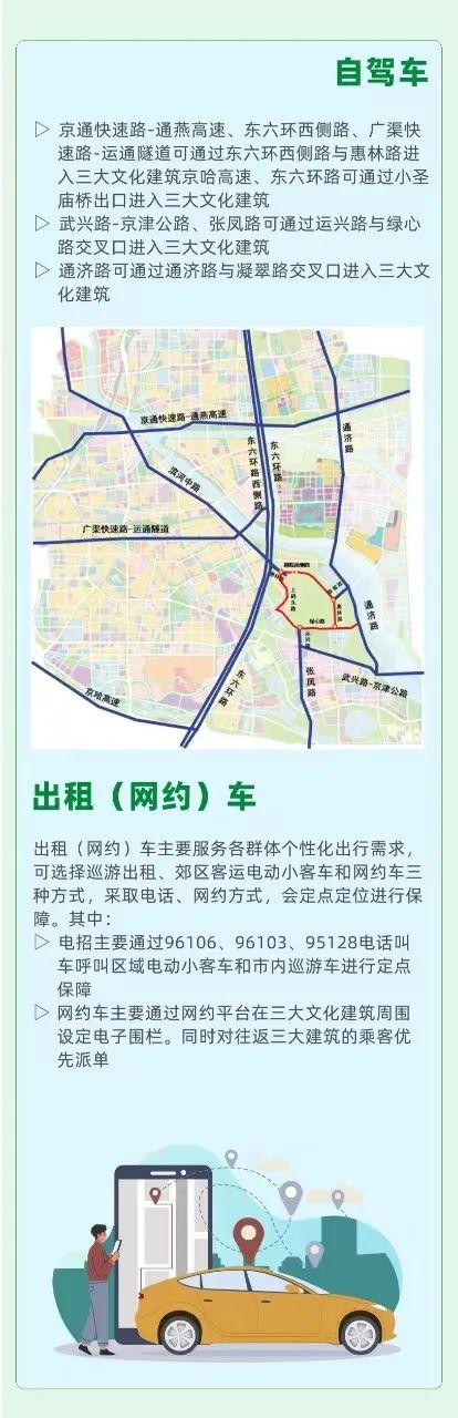 此外,市民可采取电话、网约方式选择巡游出租、郊区客运电动小客车和网约车三种方式出行,其中电招主要通过96106、96103、95128电话叫车呼叫区域电动小客车和市内巡游车;网约车主要通过网约平台在三大文化建筑周围设定电子围栏,精准指示网约车辆到达指定点位载客,同时对往返三大文化建筑的乘客优先派单。