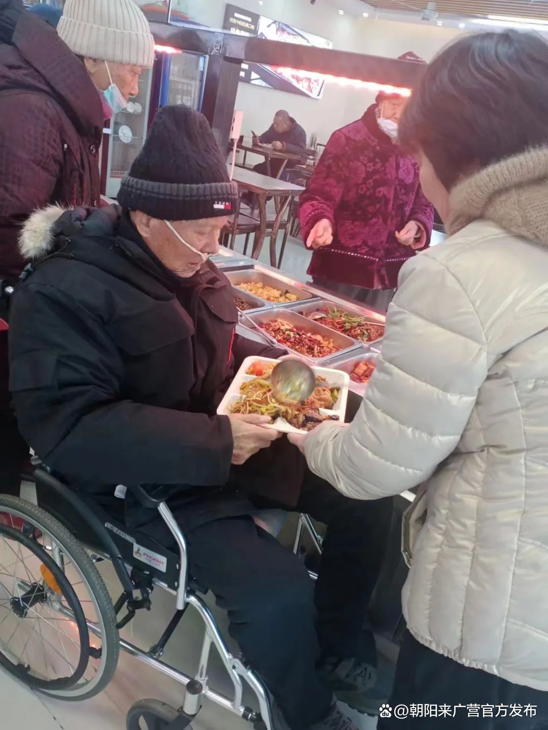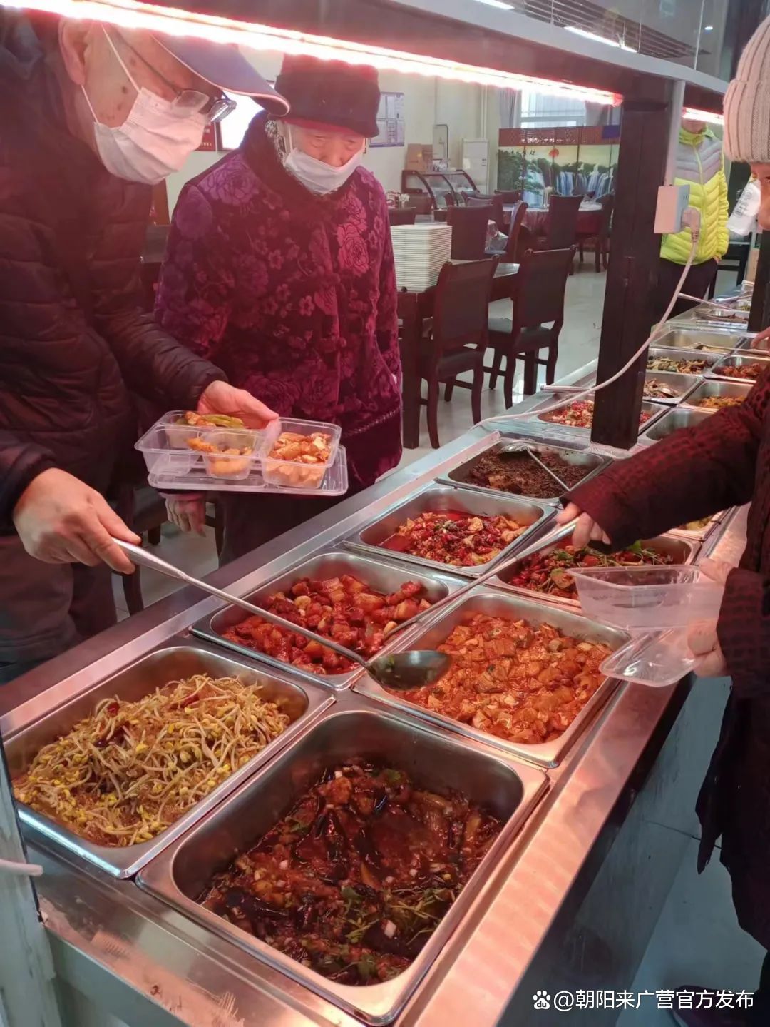 午餐时间,在来广营地区北苑一号院养老服务驿站内,老人们正排队取餐,营养美味、热气腾腾的菜品令人垂涎欲滴。工作人员各司其职,有条不紊引导老人、帮助大家打饭。