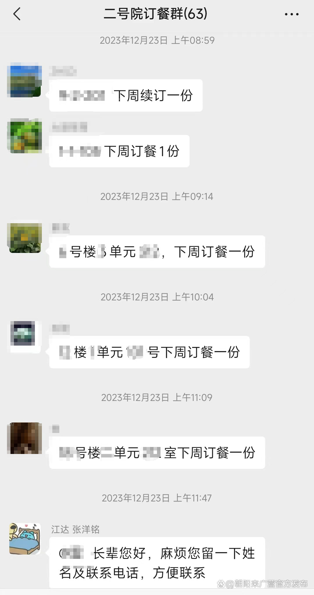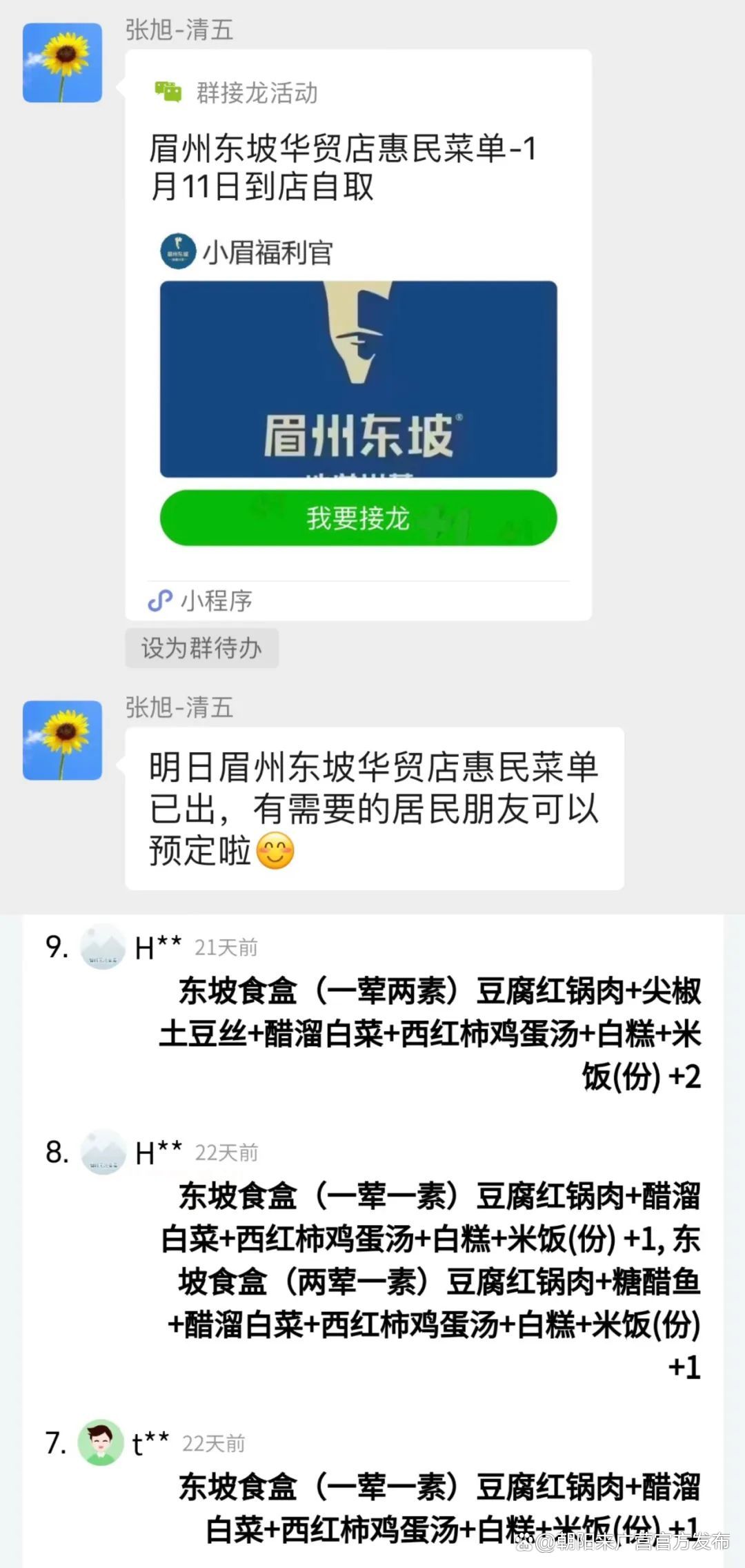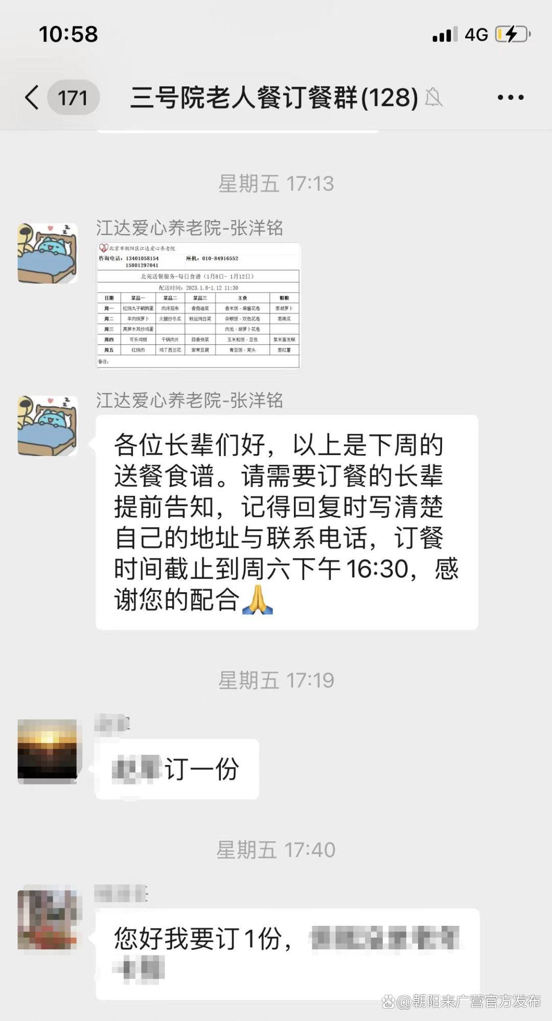 在订餐群内,工作人员每周五时会提前发布下周菜谱,需要订餐的老人可以直接在群内接龙回复,配送也是由社区工作人员与养老院工作人员直接送餐上门,全方位保证菜品配送的安全。
