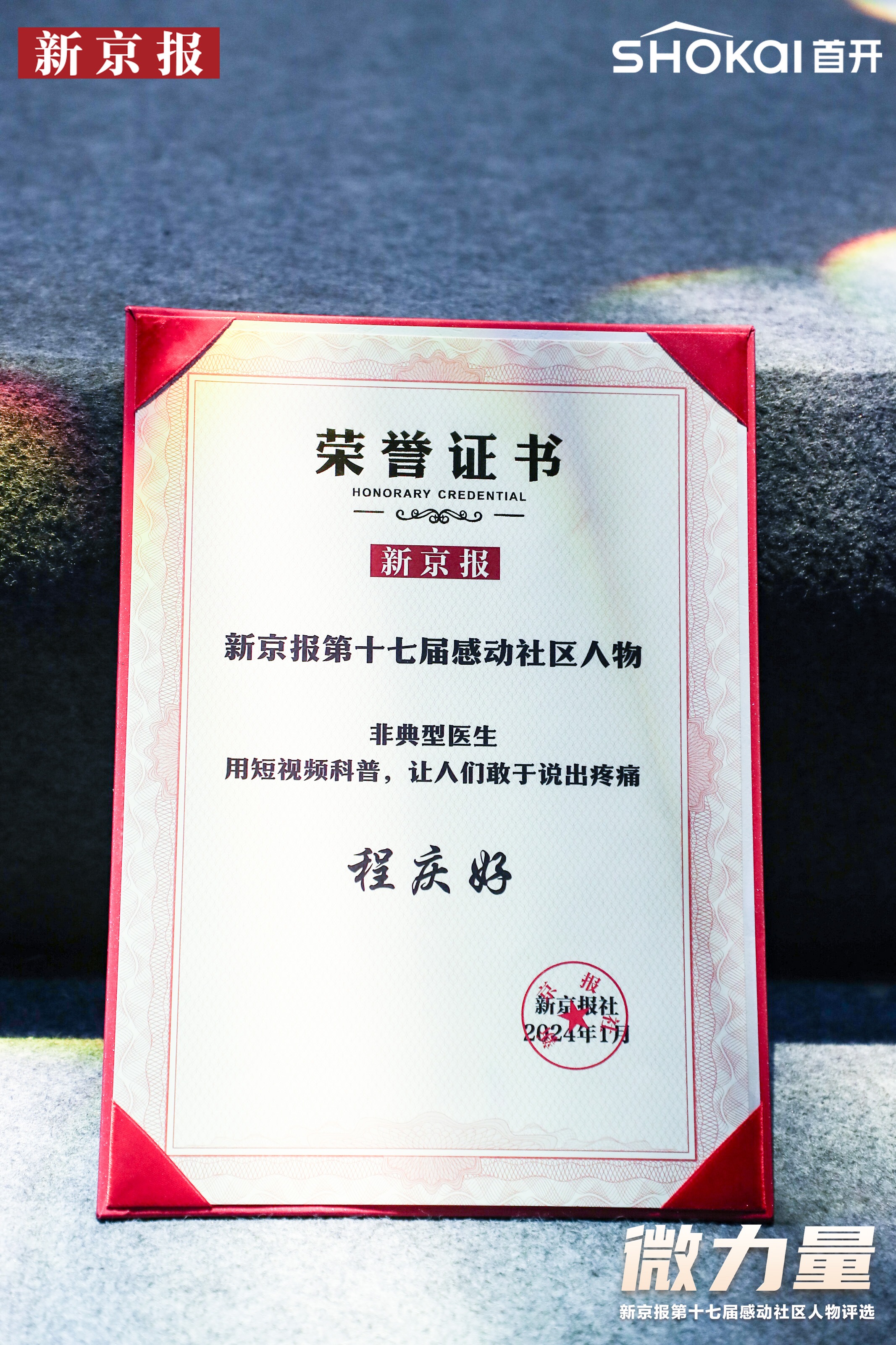 1月16日下午,“微力量”一一第十七届感动社区人物评选颁奖活动在北京广播大厦酒店举行。应急总医院疼痛科主任程庆好获得2023年度“感动社区人物楷模奖”。在颁奖现场,程庆好的演讲感人至深,赢得阵阵掌声。
