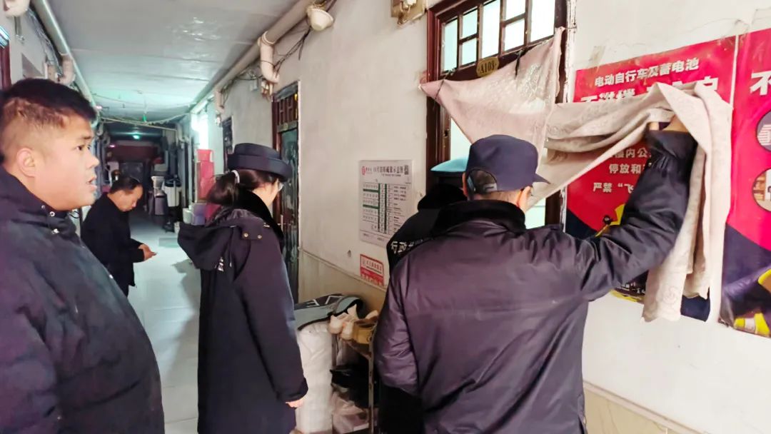 在检查过程中,工作人员主要针对电动自行车是否违规停放,是否存在私拉乱接电线充电等情况进行排查;对用气用火用电是否存在消防安全隐患进行检查;并对安全疏散、应急照明、灭火器等消防设施的配置是否符合要求,是否存在私自占用堵塞消防疏散通道等情况进行检查。