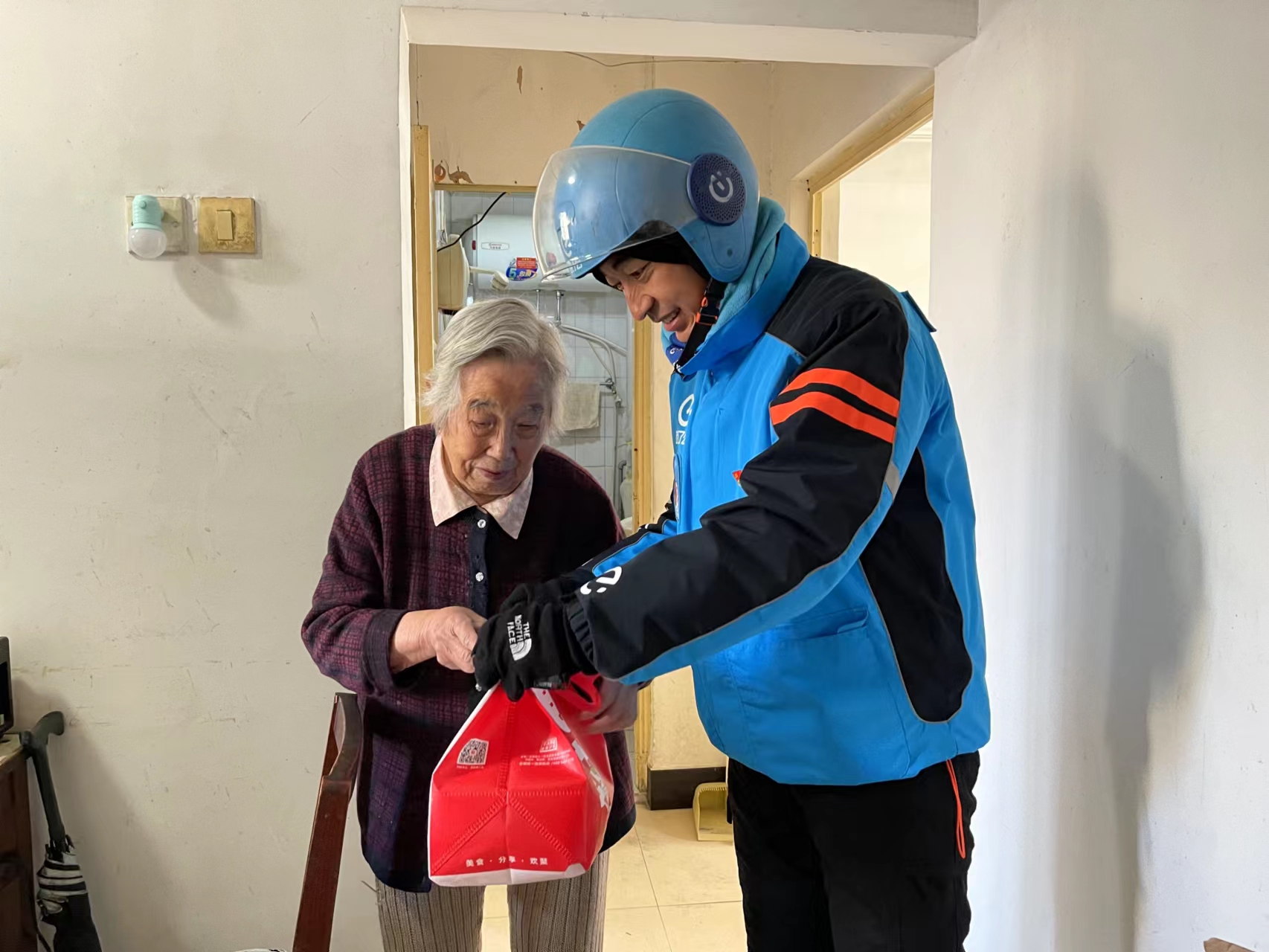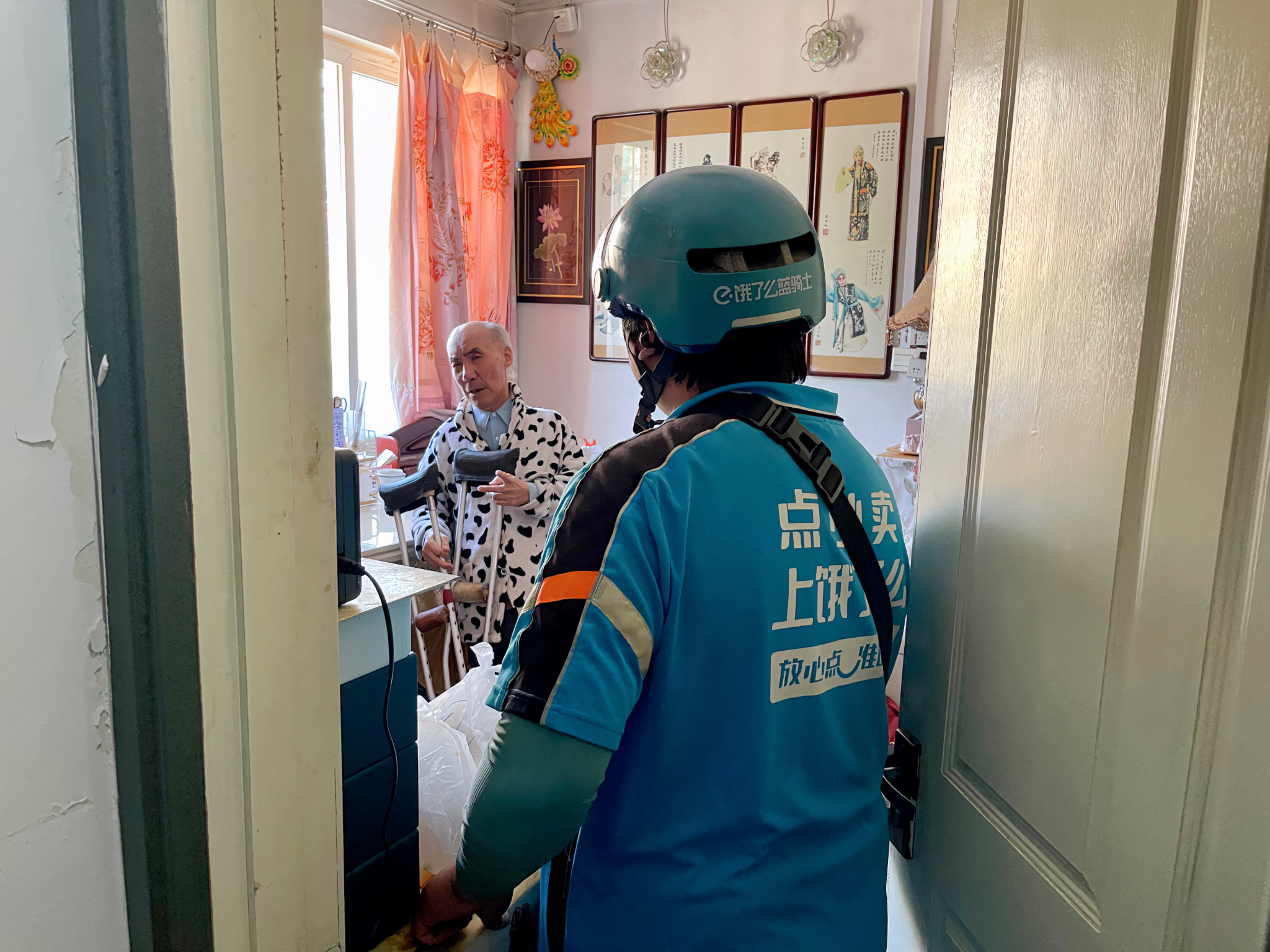 王鹏飞是首批加入志愿队的外卖骑手,河北保定人,今年33岁,一张圆脸因风吹日晒而通红。“一开始寻思着,这有啥难?不就是多跑几趟的事儿嘛。”活儿一上手,才知不简单。他每天要为老年餐桌配送6到8单,先后跑过水碓子、中路南、北二条等好几个没电梯的老小区。老人们又普遍听力不好、腿脚不便,敲门之后得耐心等上好一会儿。他有点后悔,“时间和精力消耗,比普通订单大多了。”