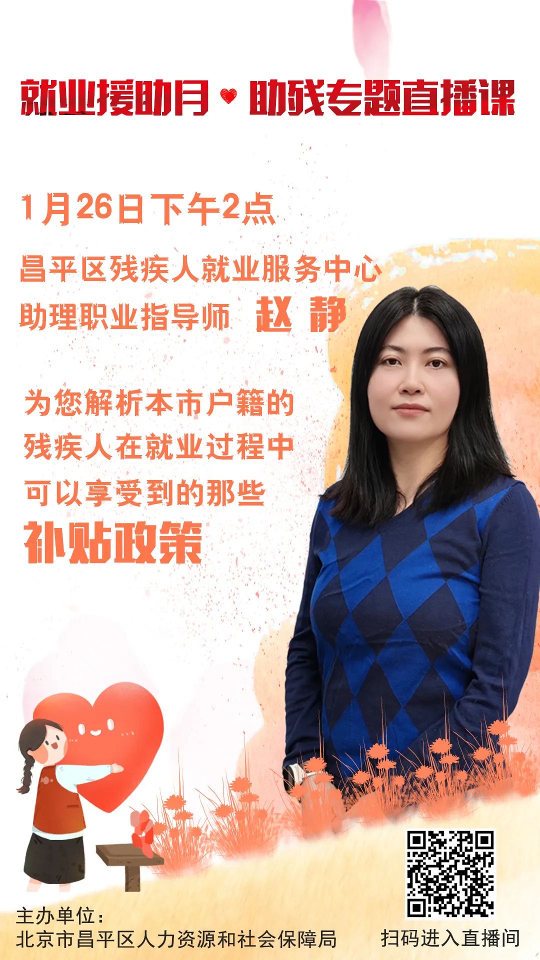 1月26日(星期五)下午2:00就业援助月·助残专题直播课,昌平区残疾人就业服务中心助理职业指导师赵静为您解析本市户籍的残疾人在就业过程中,可以享受到的补贴政策。