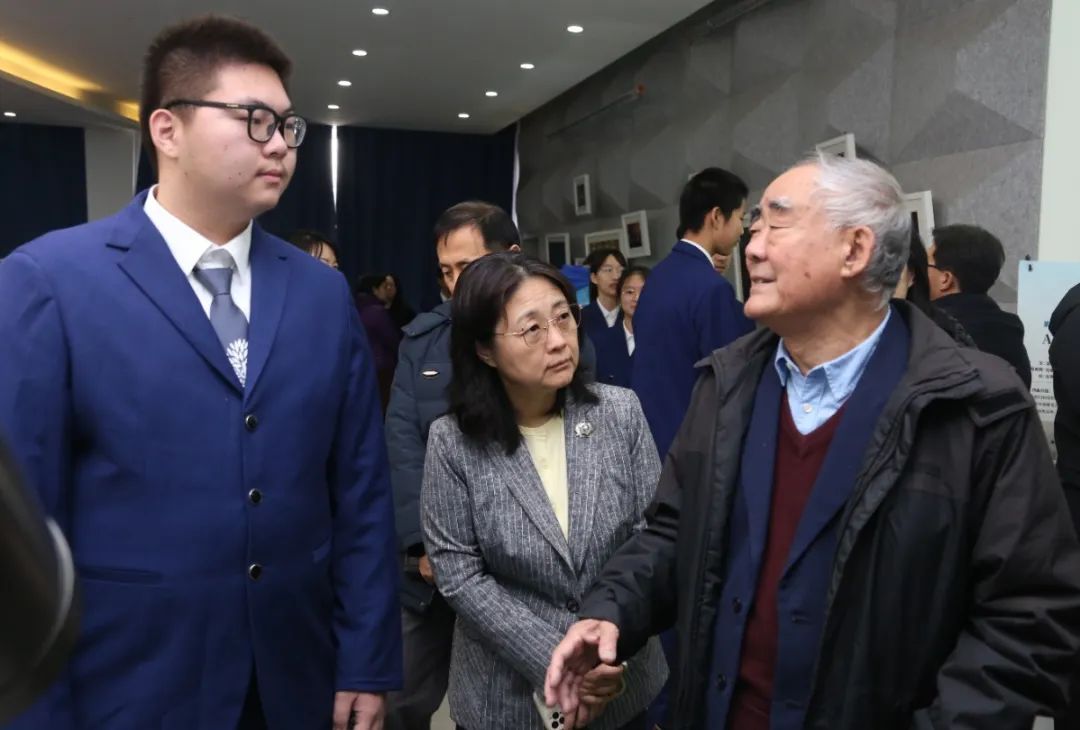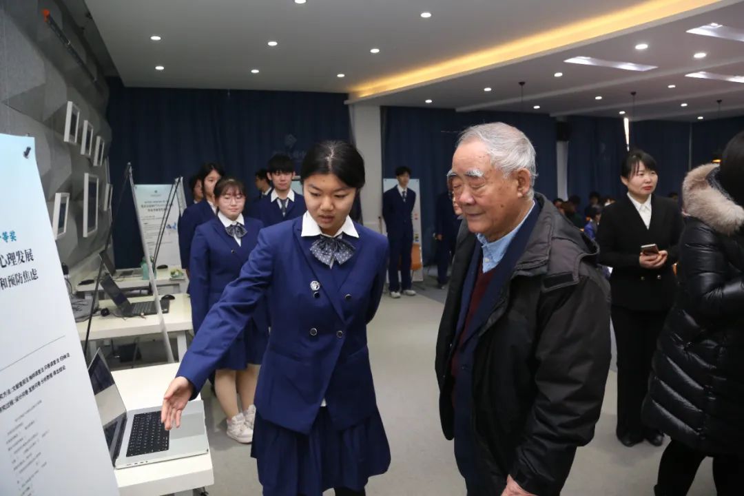 聘任仪式前,汪景琇院士观看了大峪中学金鹏科技团学生们的科技成果展,展览包括生命科学、创新发明、机器人、编程设计、社会科学等多个领域的科技教育成果,展示了大峪中学的科技品牌和亮点。