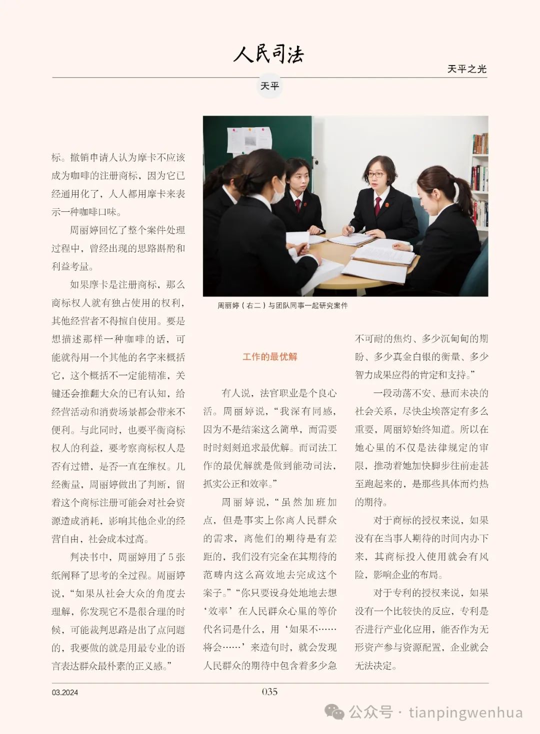周丽婷这样谈起别人看起来可能枯燥单调的18年审判生涯,“总会有新鲜的东西进来,比方说可能我办熟了商标的案子,我还想去看看专利是什么样子。我办了专利案子之后,我就想着垄断案子是什么样子。”她浅浅笑着,那些内心不断升腾起的热气和冲动,那些对理想和角色的不停追逐,一一浮现。