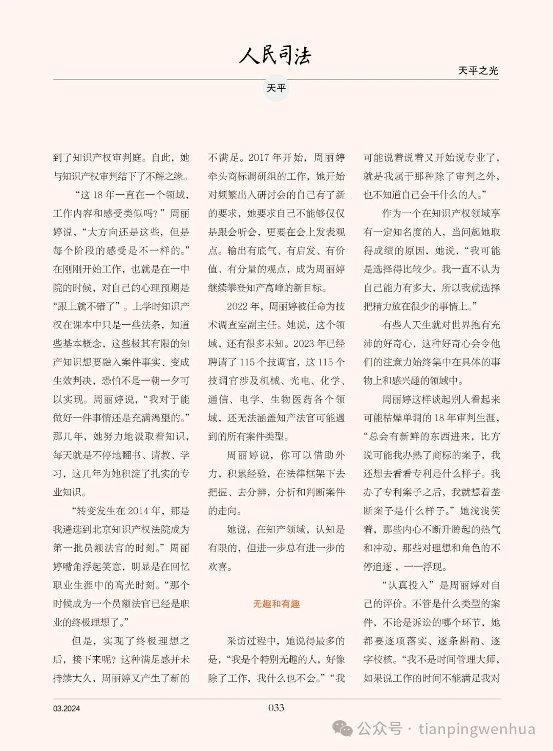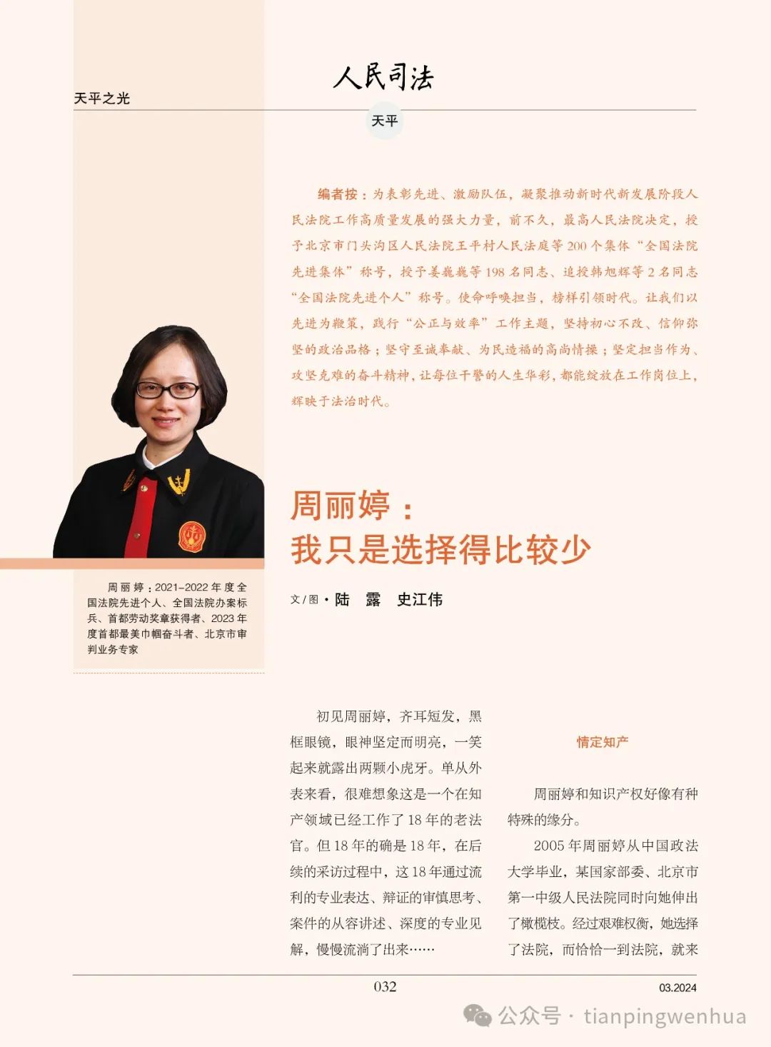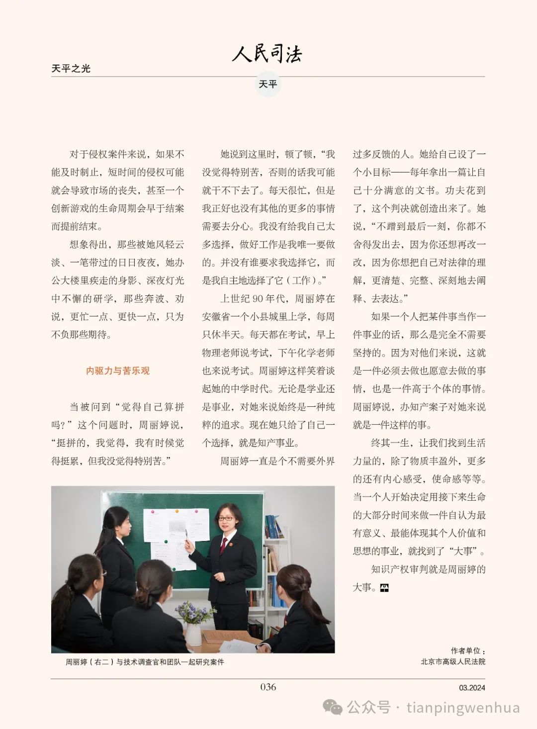 “转变发生在2014年,那是我遴选到北京知识产权法院成为第一批员额法官的时刻。”周丽婷嘴角浮起笑意,明显是在回忆职业生涯中的高光时刻。“那个时候成为一个员额法官已经是职业的终极理想了。”