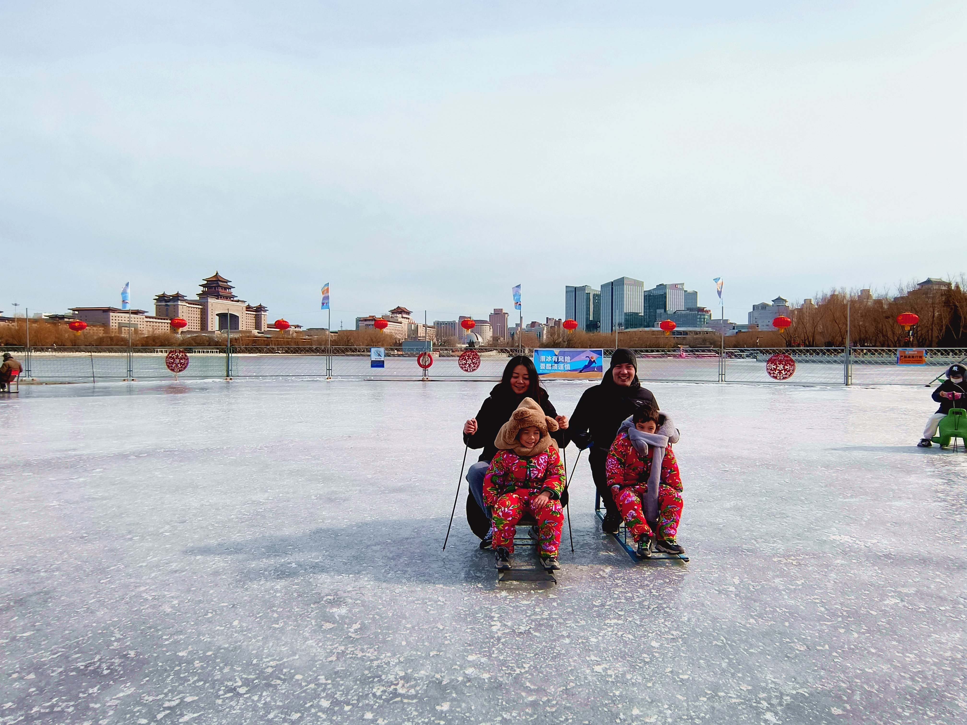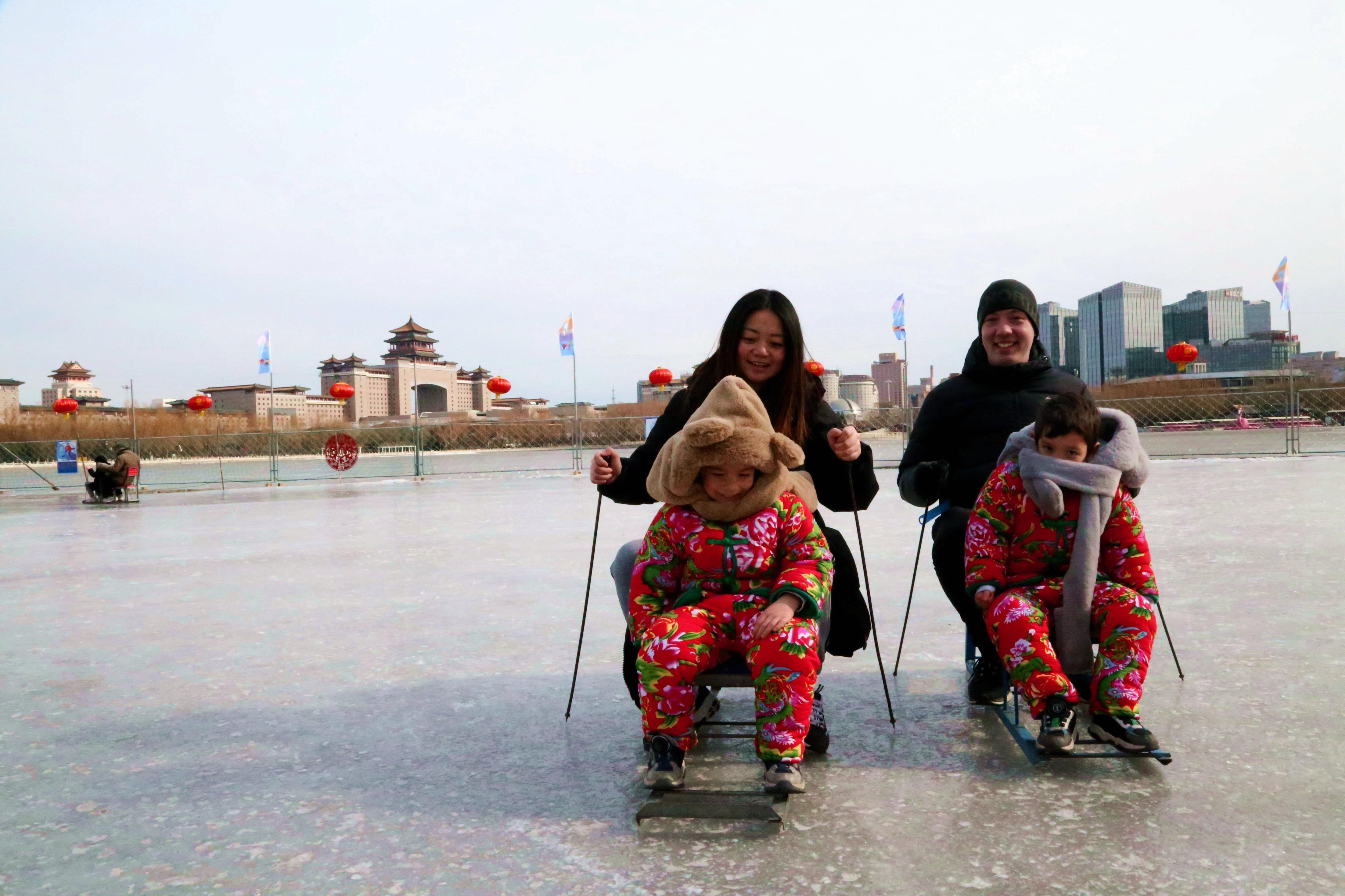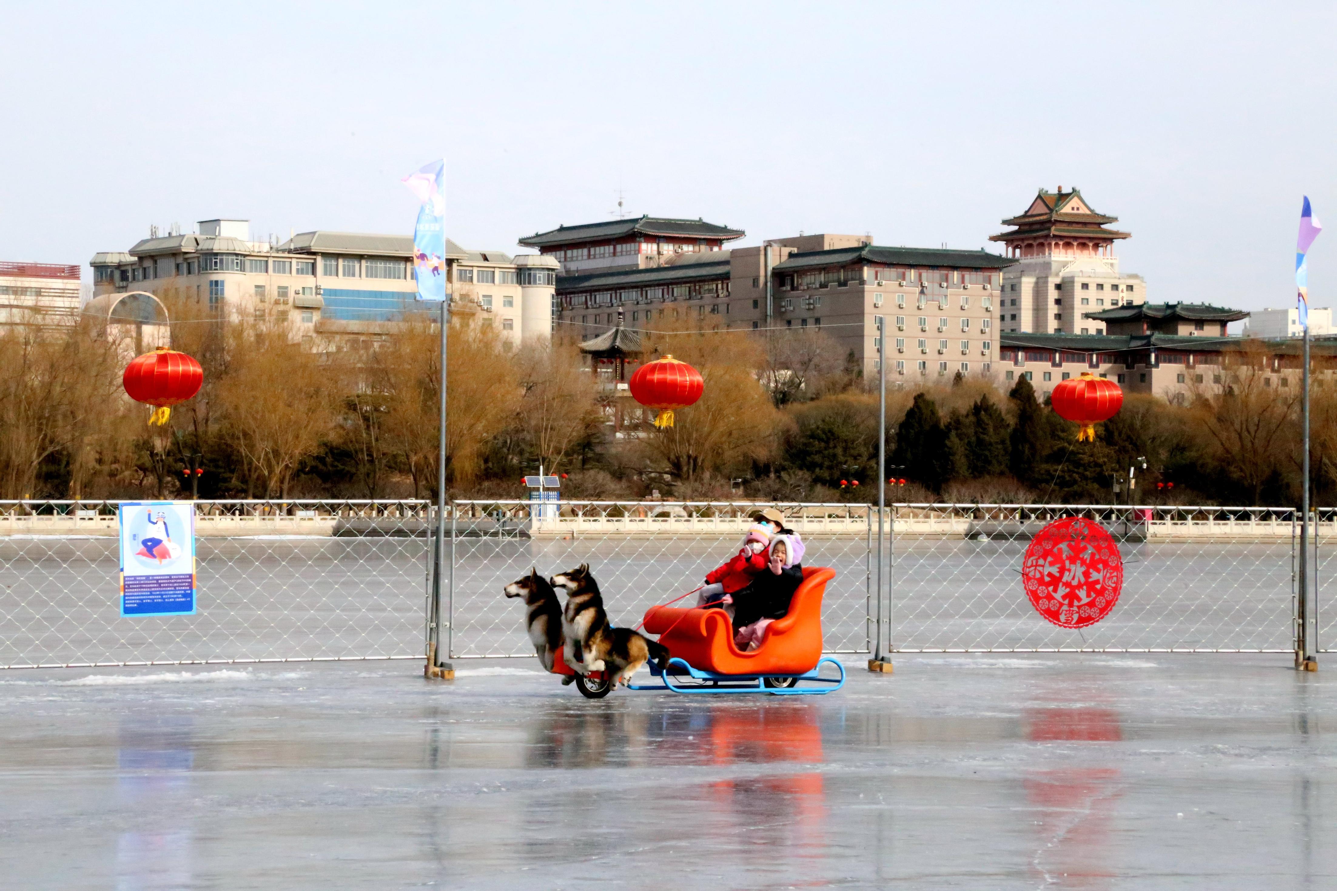 在西门附近2000平方米的莲花池冰场上,很多大朋友和小朋友正在追逐嬉戏,有的是爷爷坐在冰车上小朋友在后面推,有的是爸爸妈妈各带着一个小朋友进行滑冰比赛,还有的是在玩有动力的狗拉雪橇。“这个冰场真的太划算了,40块钱一个人,无动力的随便玩,有动力的如狗拉雪橇等设施也比别处收费低,而且还能边玩边赏风景,看看远处西站的城门楼,近处的野鸭鸳鸯,别看天气冷,但是心里特畅快。”家住附近的居民路女士说。