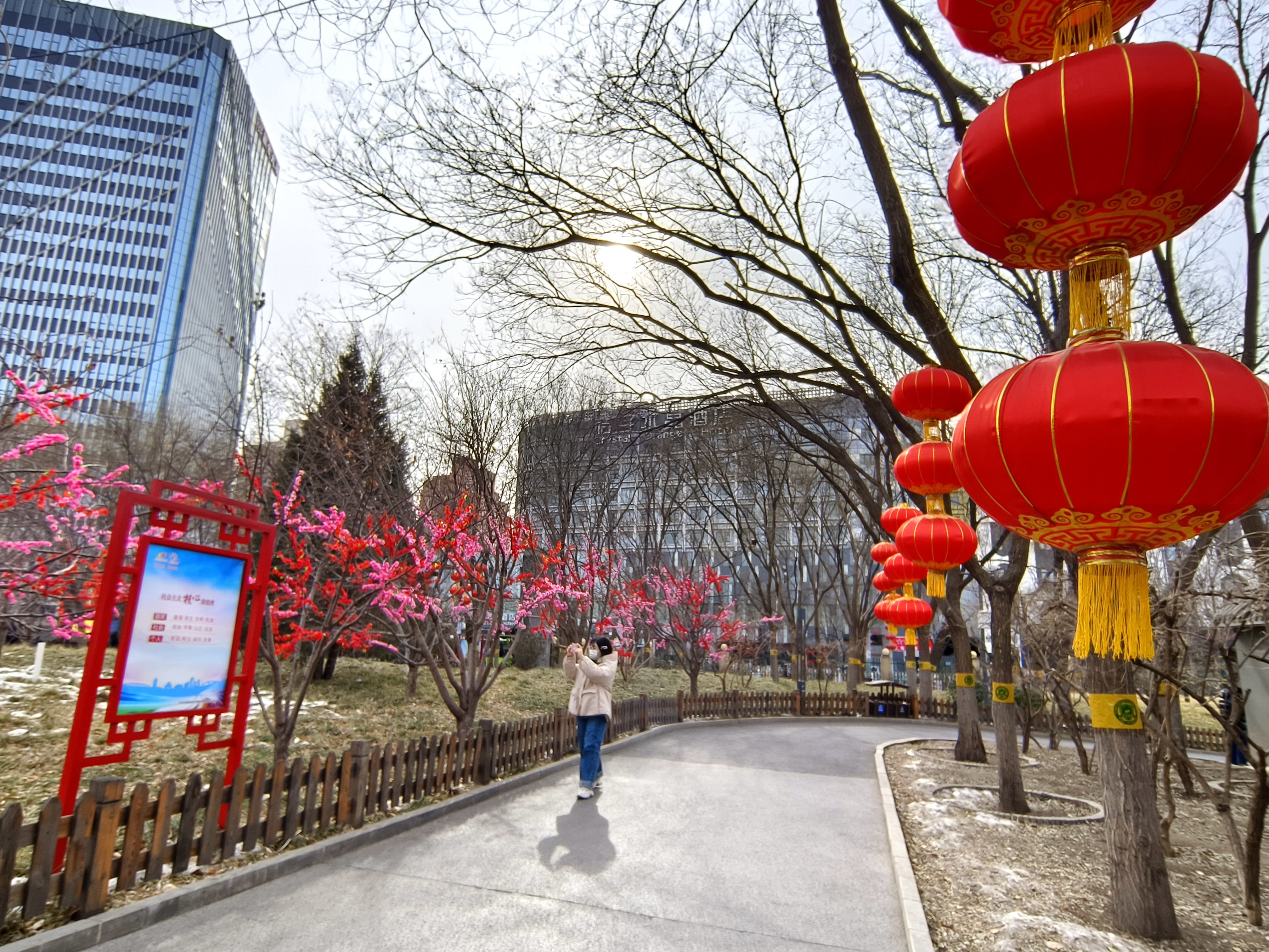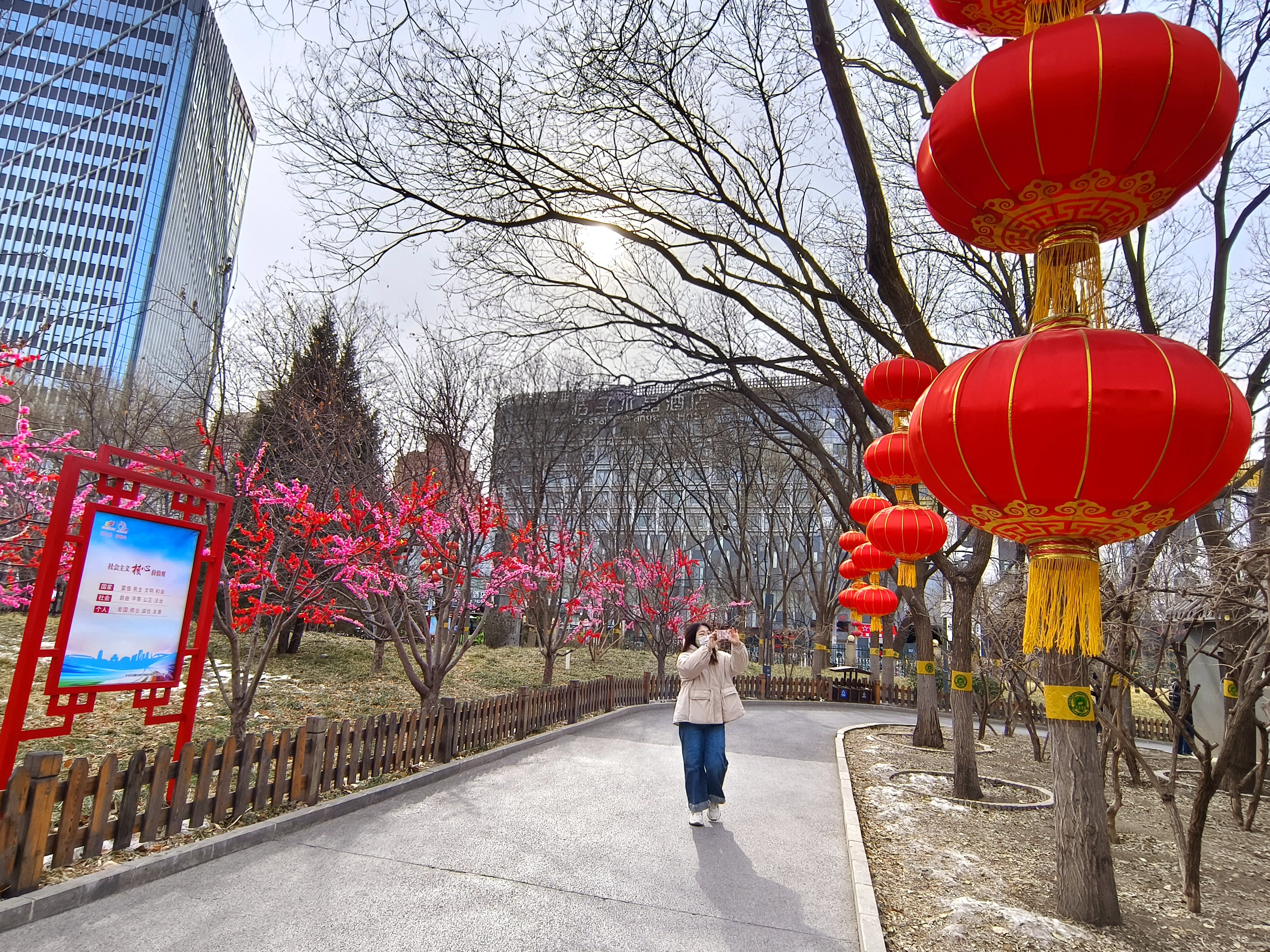 2月1日上午,记者来到位于丰台区的莲花池公园,从东门进入,只见公园的步道旁、环廊里、广场上,一盏盏、一串串大红灯笼随风摇曳,整个园区共悬挂1018盏灯笼,还有精心装扮的几十株红粉相间的花树,烘托出浓浓的年味儿,为游客增加了过年的喜气。记者了解到,春节假期期间,从大年初一至初八以及正月十五,莲花池公园还将举办投壶、祈福、猜灯谜等系列年俗活动,为群众的春节增添欢喜、送上祝福。