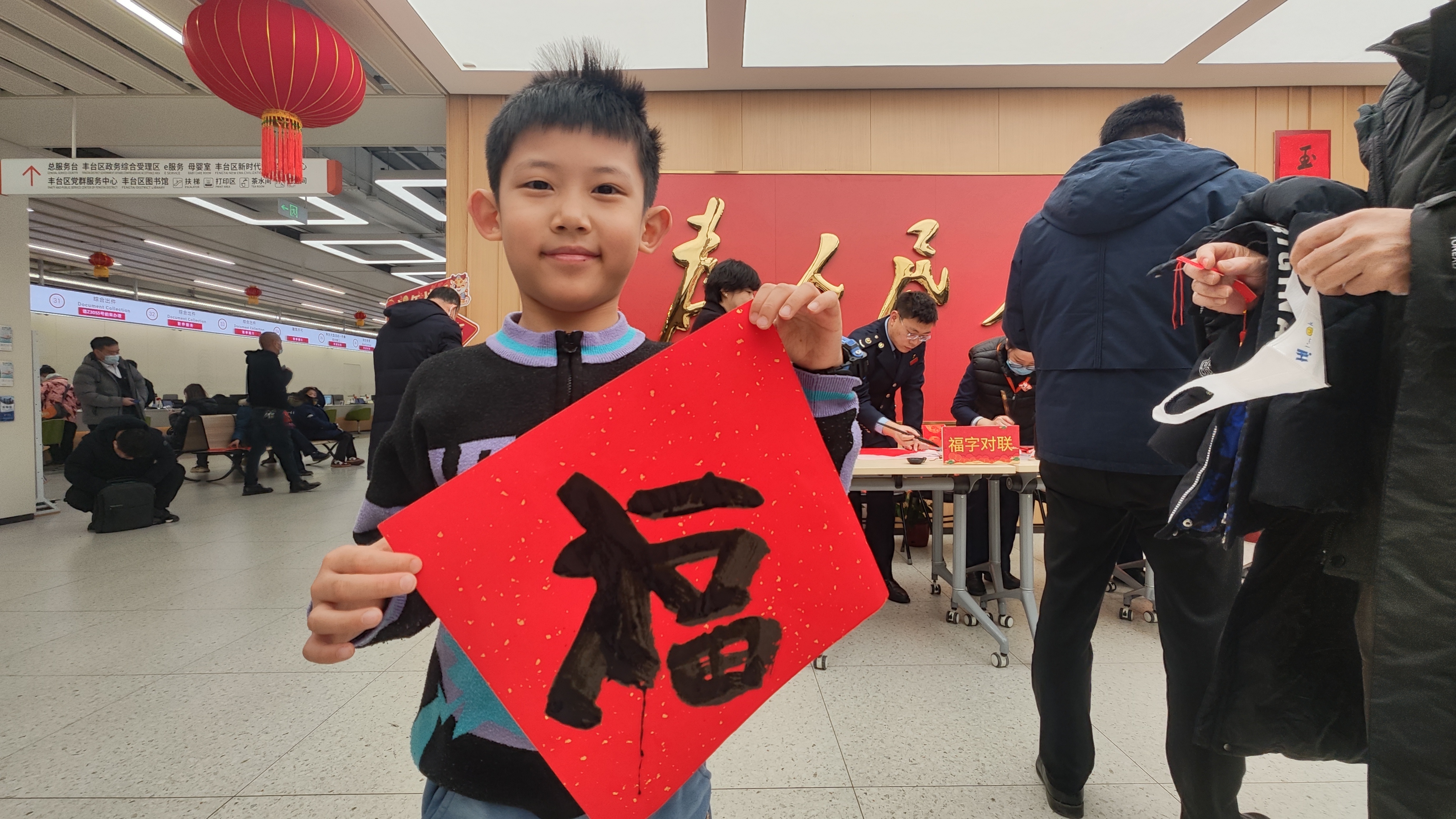 参与书写福字的综合受理专区工作人员徐文煊注意到人群中有位小朋友跃跃欲试,便邀请小男孩一起写福字。“孩子今年上一年级,非常喜欢中华传统文化,刚刚还在追问我关于福字的不同写法,这次有机会参与毛笔书写,感谢丰台区政务服务中心有这么贴心的活动,对孩子来说真是一次非常难得的体验。”小男孩姥爷笑着说。