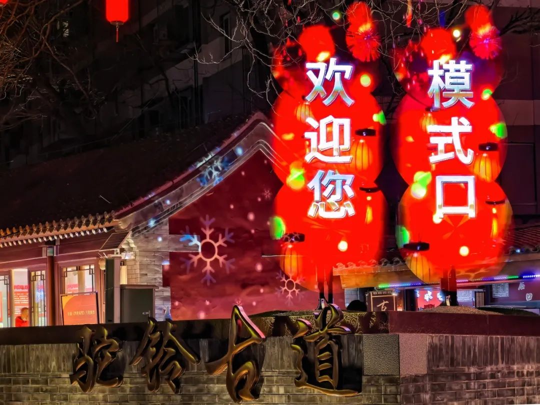 漫步街区,各式各样的灯笼、蝴蝶造型的霓虹灯、花卉灯栩栩如生,彩灯装点之下的驼铃古道年味浓郁,呈现出一幅繁华老街的美丽画卷。