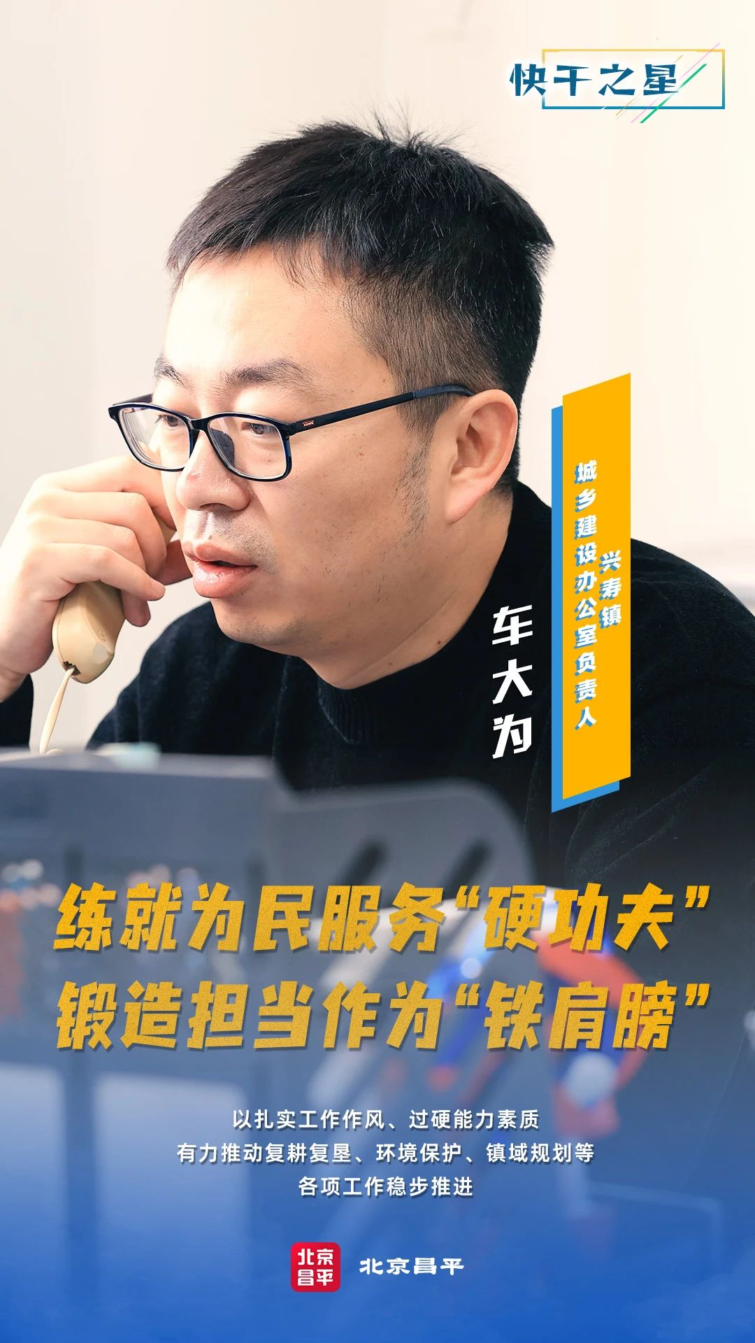 车大为,中共党员,兴寿镇城乡建设办公室负责人,以扎实工作作风、过硬能力素质,有力推动复耕复垦、环境保护、镇域规划等各项工作稳步推进。创新“三点三化”统筹推进机制,镇级协同调度、提前谋划、逐块分析,保障兴寿镇复耕复垦完工面积和通过验收面积均排名全区第一;探索“五步”管控机制,2023年施工质量区级验收合格率提高至100%。