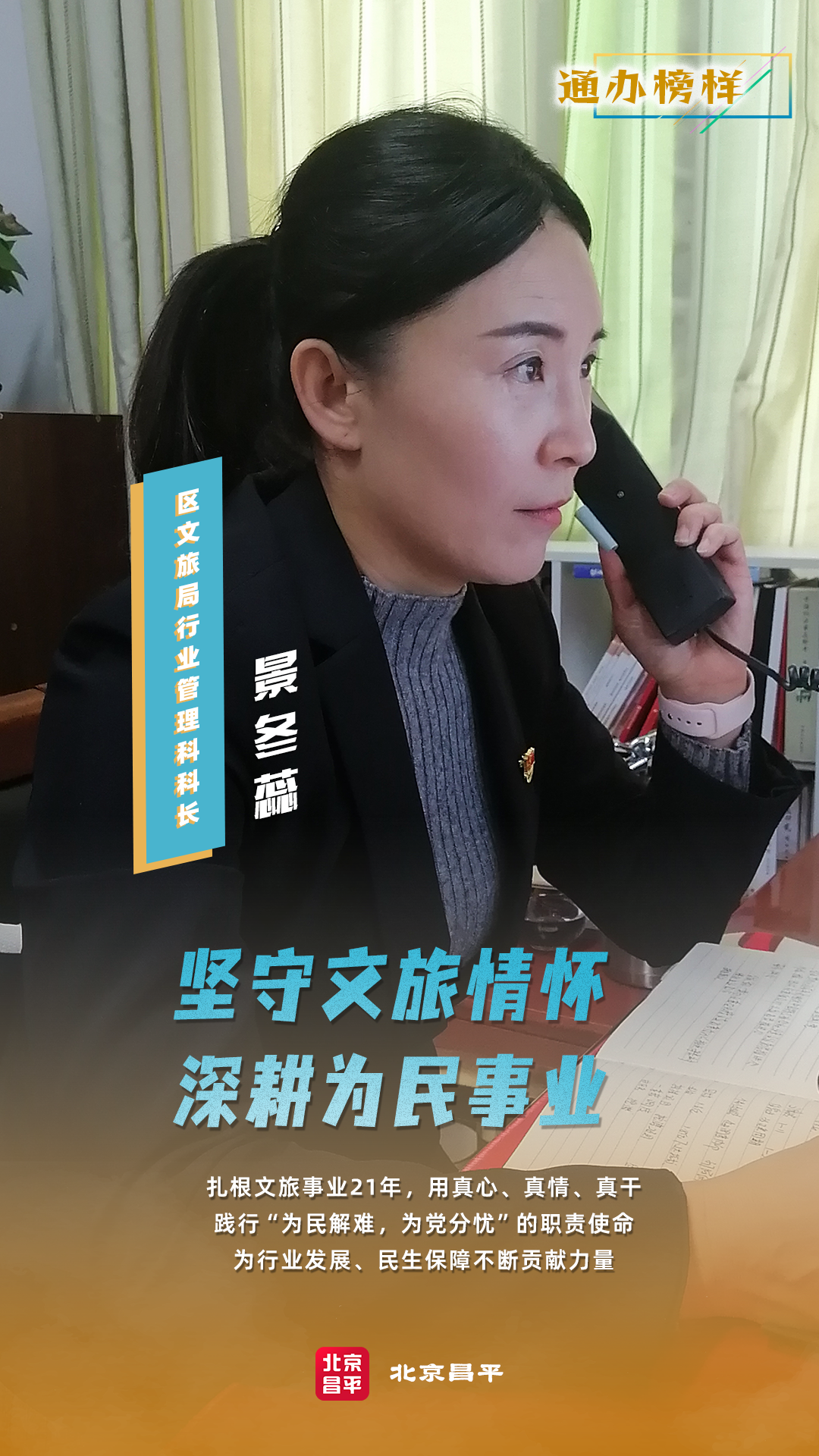 景冬蕊,中共党员,区文旅局行业管理科科长,扎根文旅事业21年,用真心、真情、真干践行“为民解难,为党分忧”的职责使命,为行业发展、民生保障不断贡献力量。为民解忧办实事,组建“靠前服务专项服务小组”,为企业提供许可材料审查服务指导;牵头负责全局九成以上接诉即办工单,用心用情解决群众诉求,在市文旅局考核行业类投诉办件综合分100分,排名第一。