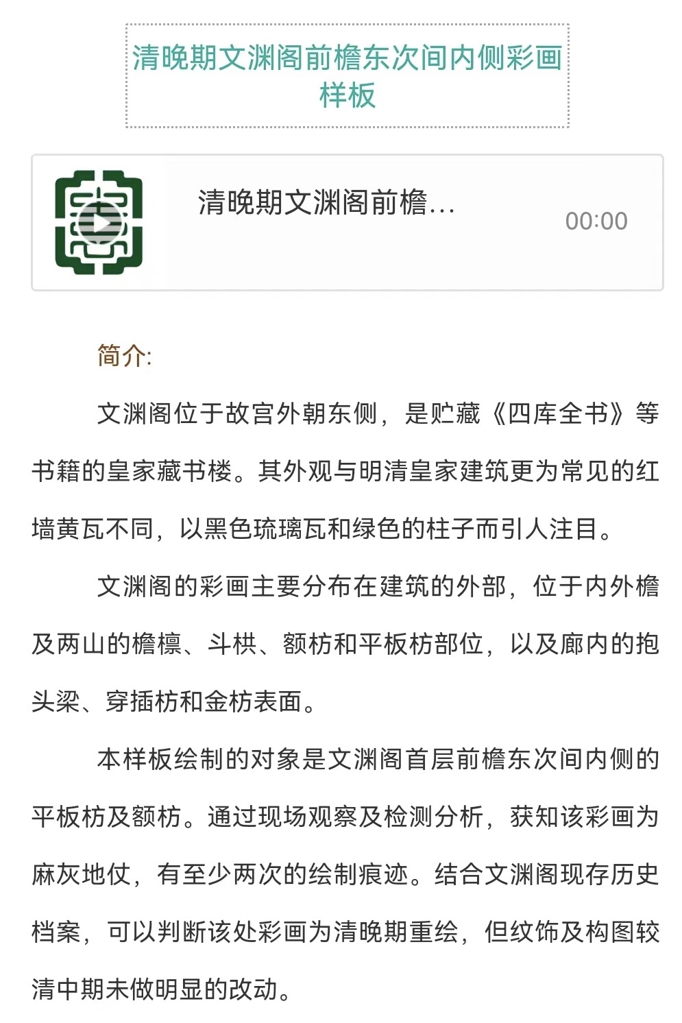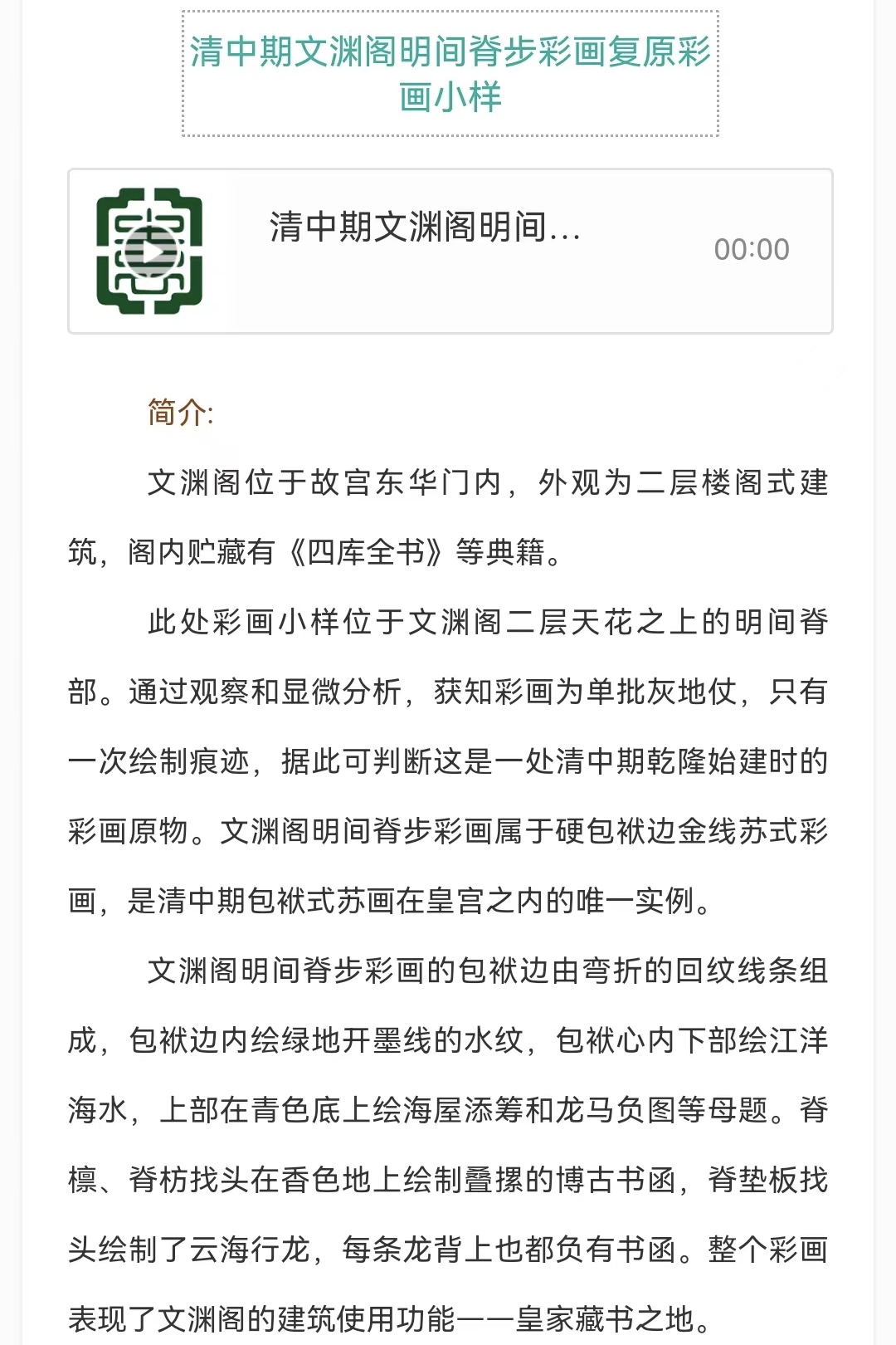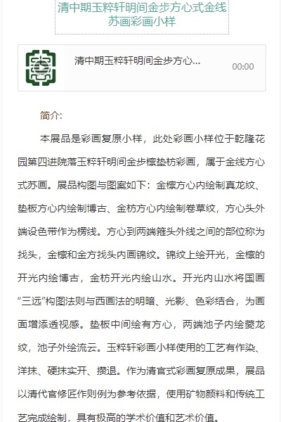 “锦色Ⅱ——探寻江南建筑彩画”线上数字展,由园博馆官方导览小程序,与线下展览同步推出,通过线上讲解与图文搭配的形式,讲述一幅幅华锦鲜丽的彩画背后的故事。观众可以通过扫描展厅中的二维码,“码”上听讲解,还可以随时随地把心动的展览“带”回家。