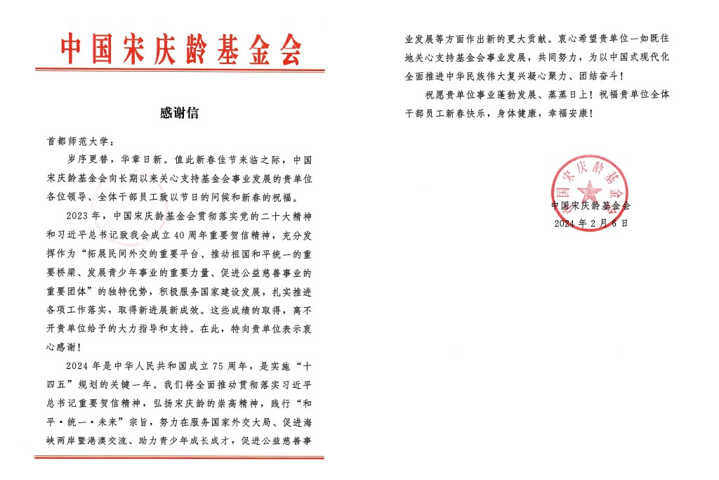 近日,首都师范大学收到中国宋庆龄基金会发来的感谢信,对首都师范大学长期以来支持中国宋庆龄基金会事业发展表示感谢,向学校领导、全体干部员工致以节日的问候和新春的祝福。