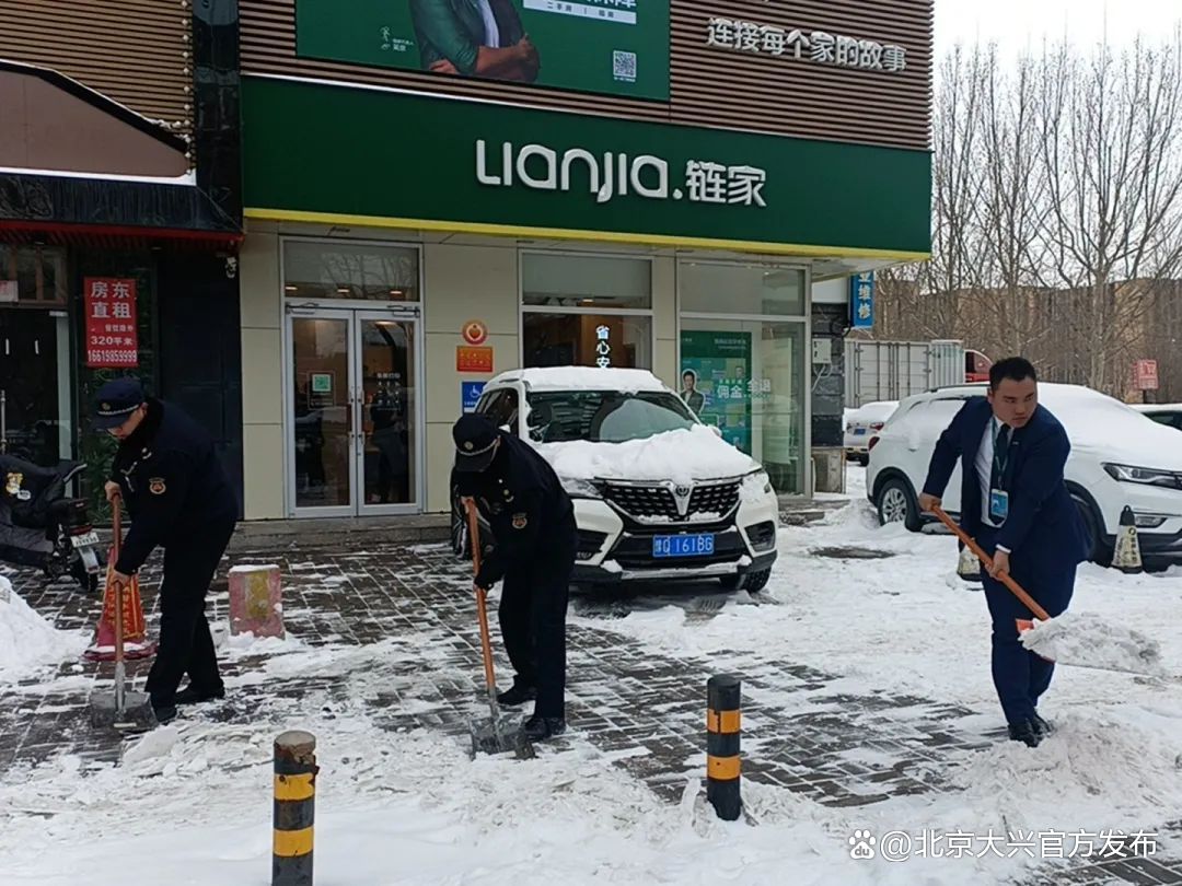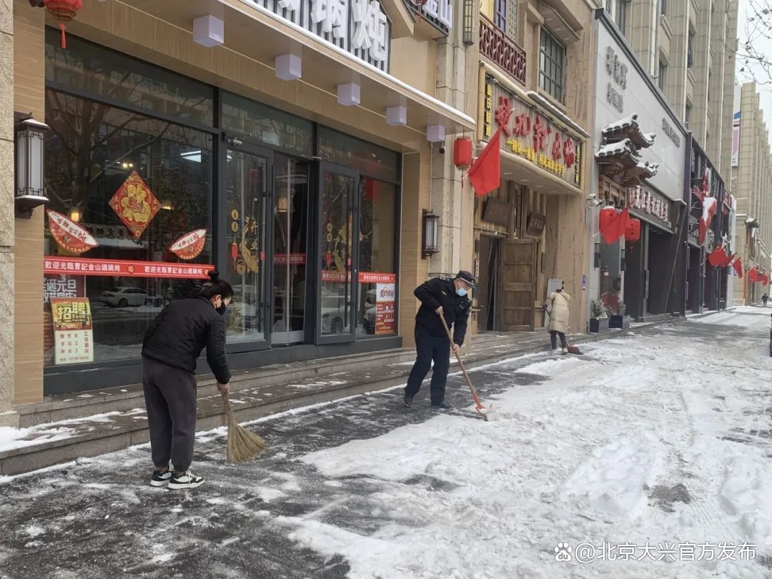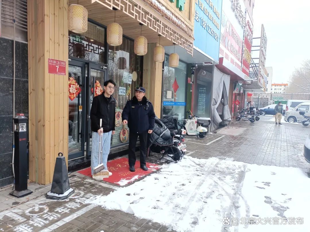 在彩虹新城商圈、天键广场商圈等地,综合行政执法队督促各单位落实“门前三包”责任,针对降雪后易出现的安全隐患,提示负责人及时加固、维修临街广告牌匾,避免因残冰积雪造成事故,并主动作为帮助商户清扫门前积雪。