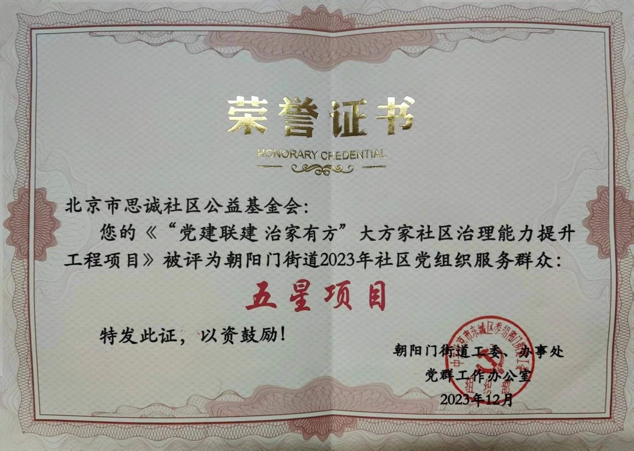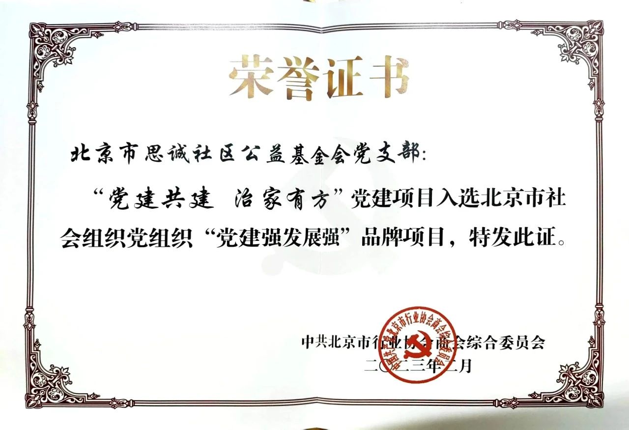 思诚公益以党建为引领,深化党建“三有四融合”“党建联建治家有方”等品牌项目,创新乐龄食堂、乐龄学堂、温暖家、友邻助老等品牌项目,实实在在服务社区和群众。党建联建治家有方项目,建立社区公益共同体,动员北京杨帆公益基金会、北京爱它动物保护公益基金会等8家基金会参与社区治理,重点服务社区一老一小、志愿者队伍培育和动物友好社区建设,共开展社区服务52场,动员培育100余名志愿者,支持了16个社区社会组织,共服务社区居民、流动人口、两新组织职工2628人次。项目入选北京市社会组织党组织党建强发展强品牌项目,被朝阳门街道评为“2023年社区党组织服务群众五星项目”。