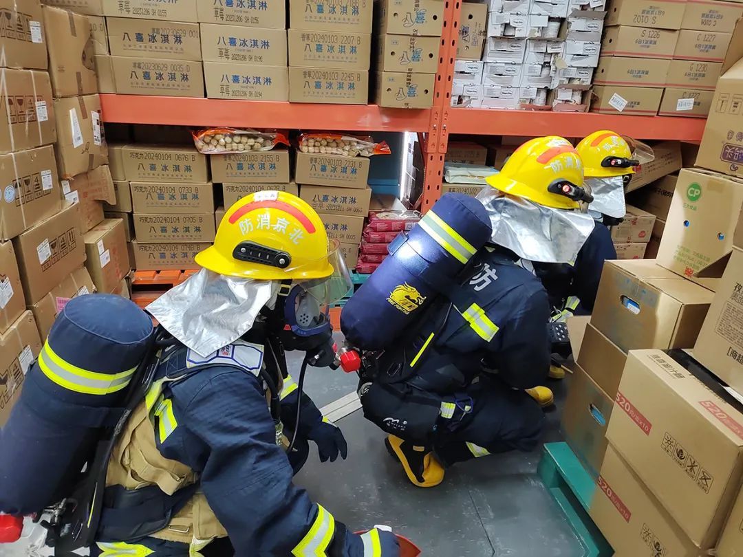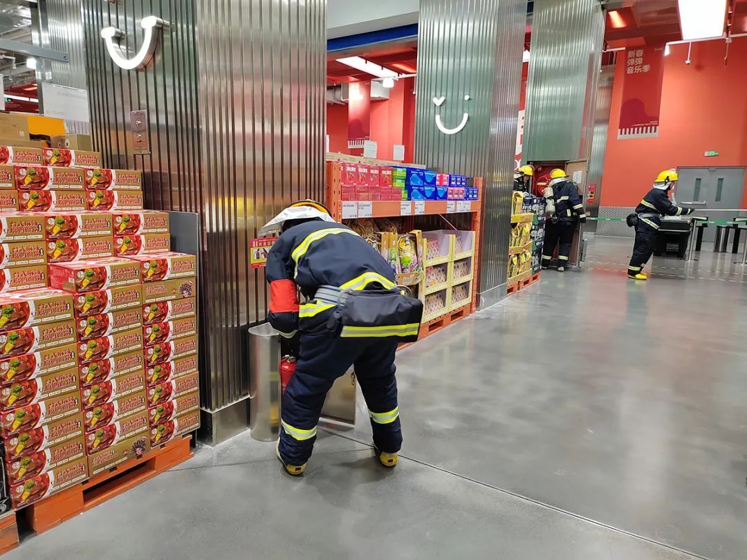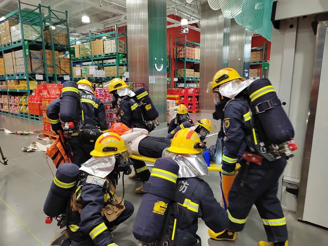 在超市内外救援力量的配合之下,火情很快得到控制。确定超市内人员全部转移完毕、现场明火扑灭之后,演练结束。