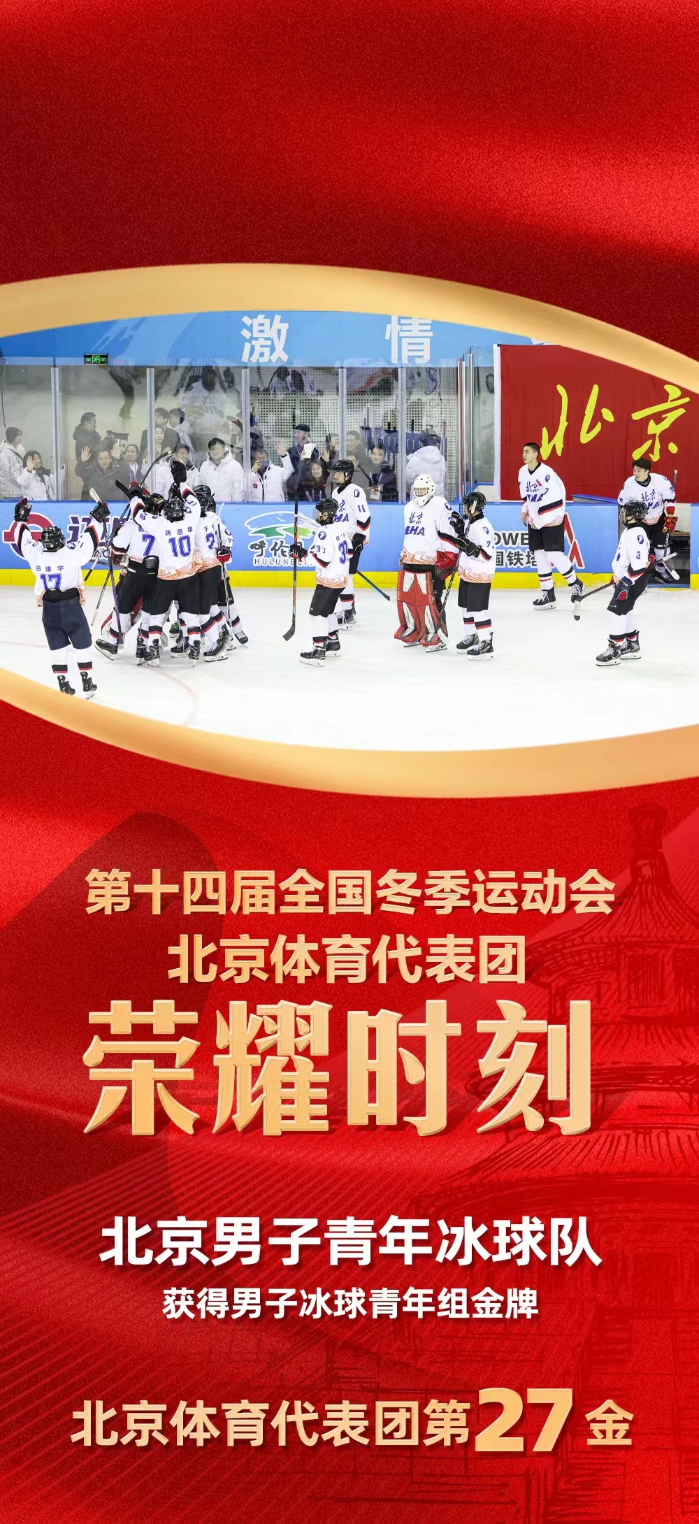 2月27日,十四冬冰球青年组男子决赛在内蒙古冰上运动训练中心冰球馆举行。北京青年男子冰球队最终以5比2战胜老牌劲旅黑龙江获得冠军,为北京体育代表团赢得本次冬运会第27金。北京体育代表团在十四冬比赛中第一块金牌始于男子冰球,最后一块金牌结束于男子冰球,在本次冬运会共获得27金11银19铜。