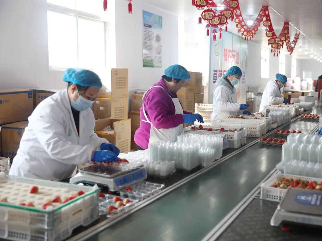 工作人员将草莓称重、装盒。