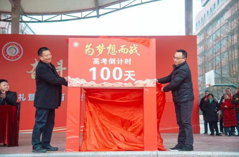 易延发校长亲自向高三年级分管副校长赖宗虎授予战旗,并与年级主任敬应国共同揭开了高考100天倒计时的牌匾。