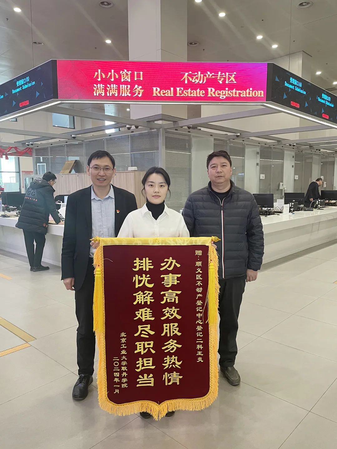 1月,区政务服务中心不动产专区收到了4面锦旗,其中一面锦旗写着“办事高效服务热情、排忧解难尽职担当”。这是北京工业大学耿丹学院送给不动产专区窗口工作人员王炎的,对她的高效优质服务表示衷心感谢。
