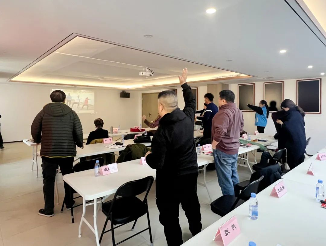 在老师的指导下,大家排列整齐,一招一式、一呼一吸地逐步掌握动作要领,大家结合讲解模仿动作,双手自然下垂后缓缓提起,尽量向上伸展,然后缓慢下落,回到原位。经过动作练习,全身关节的僵硬感得到了明显舒缓。