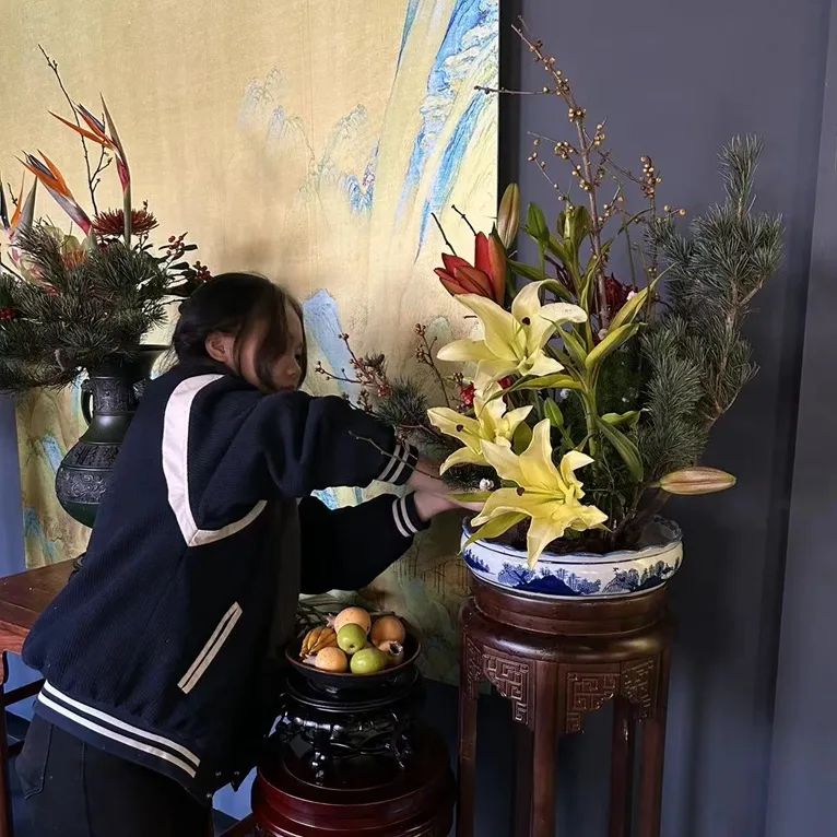 2021级学生张优冉插制的《龙游岁朝 梅生绿华》为盘插作品,作品中使用梅花为主要枝材,另插松柏,再衬佛手、柿子、石榴、苹果、橘等果品,寓意岁岁朝阳。获得2024首届中国“岁朝插花”展赛——优胜奖。