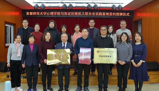 2月28日,首都师范大学心理学院与海淀区残疾人联合会举行实践基地签约授牌仪式。心理学院党委书记李会先、教学副院长黄贤军、党委副书记杨艳艳、崔丽霞教授、专业负责人张力,海淀区残疾人联合会党组书记刘永泉及班子成员、区残疾人专门协会代表,海淀区心理康复医院副院长何锐等50人出席仪式。会议由海淀区残联理事侯艳敏主持。