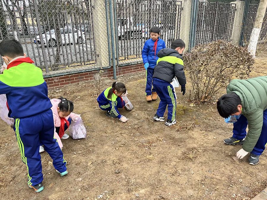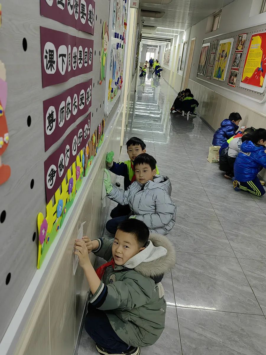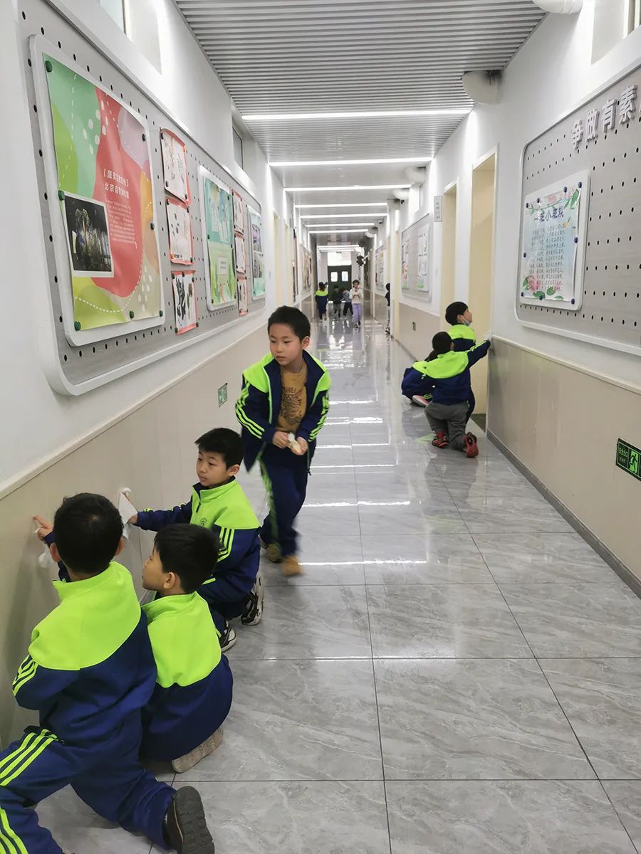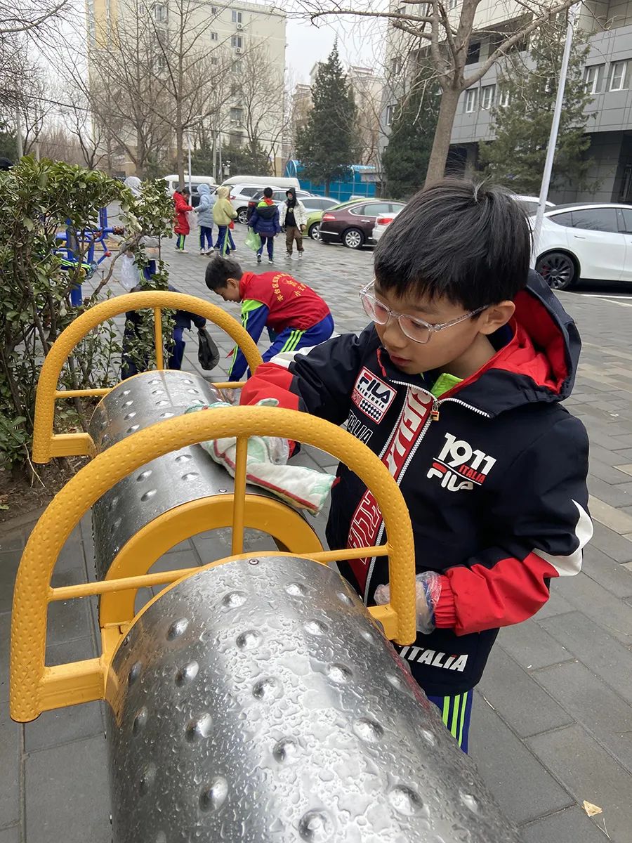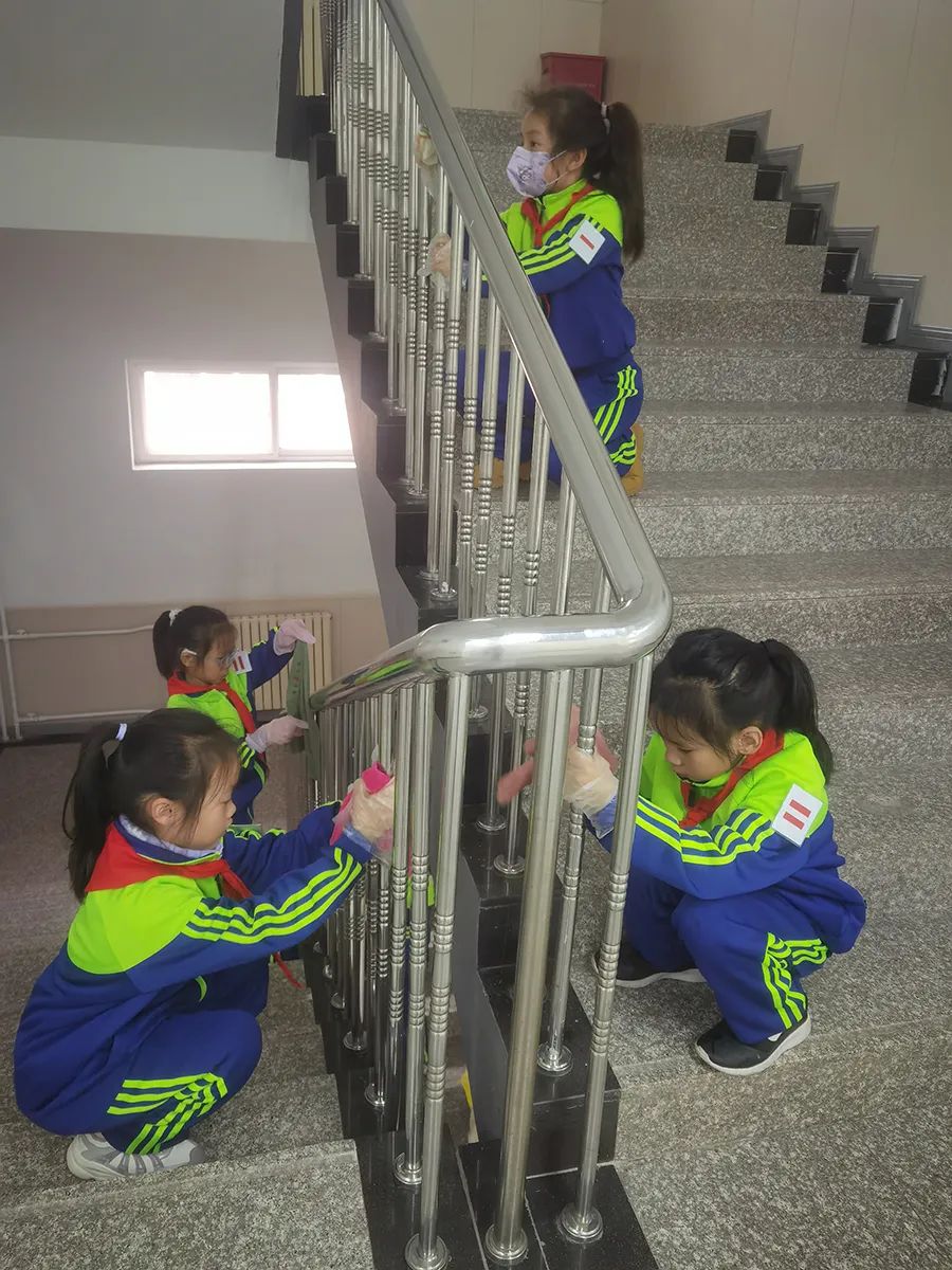 一至三年级的小同学认领校园公共区域,参与志愿服务活动。他们有的擦楼道墙壁,有的擦楼梯扶手,还有的在操场清理卫生死角,干得热火朝天。