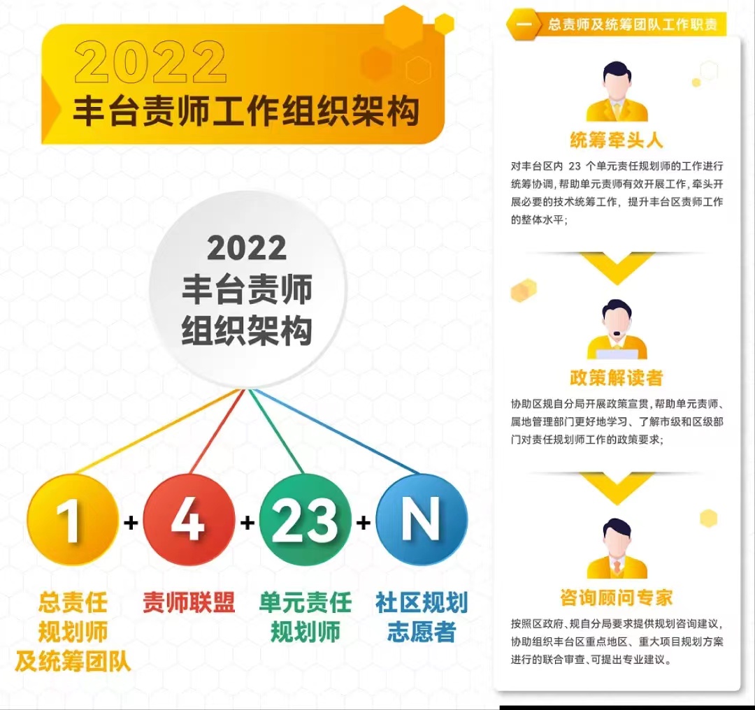 自2020年1月21日,丰台区开始聘任责任规划师,丰台“小蜜丰”责师工作机制正式建立。2022年,丰台区正式建立总责任规划师工作机制,构建了“1+4+23+N”,即“总责任规划师及统筹团队+4个责任规划师联盟+23个单元责任规划师+N个社区志愿者”的责任规划师团队制度,由总责任规划师及统筹团队整体统筹各单元责师的工作,帮助责任规划师更好地助力基层城市治理。