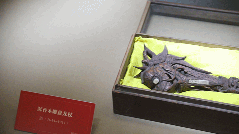 北京市颐和园管理处文物保护科科长隗丽佳介绍:“中心展厅可以看到慈禧御笔书法的‘龙’字,以及慈禧的寿礼——雕工非常精美的沉香木雕盘龙杖。盘龙杖用沉香木雕琢而成,通体用漏雕的工艺雕琢出来,十分生动。”