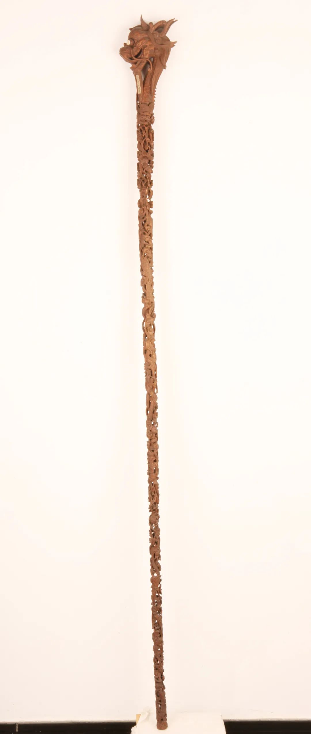 此杖为沉香木制。杖体通体镂雕而成,杖首雕刻立体成龙头状,杖身透雕祥龙穿梭于祥云之间,时隐时现。龙杖纹饰造型生动,雕刻细腻,线条流畅,形象生动。