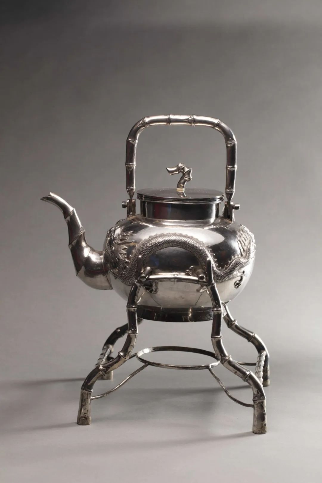 一套两件,分为茶壶和烧水架。圆形壶身,腹部以捶揲工艺饰龙纹,器盖、流饰竹节纹。银架呈弧形,分四足,饰竹节纹,底部设灯架,用于煮水。