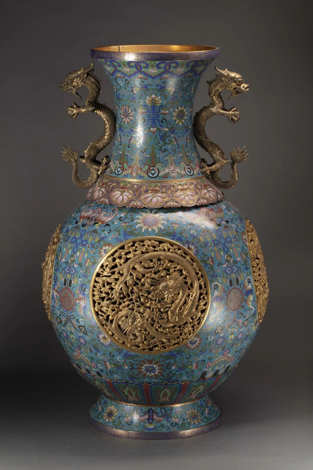 铜胎掐丝珐琅福寿缠枝莲纹双耳转心瓶