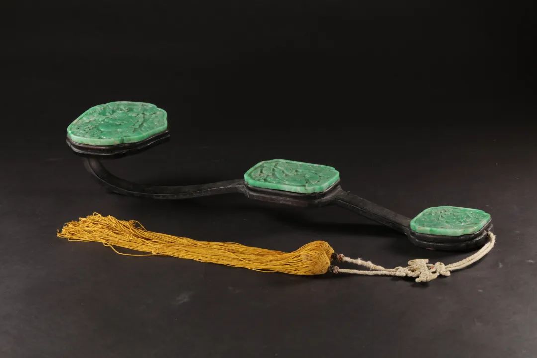 翡翠质,紫檀木柄。云头形首,海棠形腹和尾部,皆嵌有翡翠饰片。首部雕“祥龙戏珠”,龙身体弯曲,似从海中跃出,口吐仙气,将悬于空中的灵珠包裹其中。中腹及尾部雕饰为花鸟纹。尾有象鼻孔,系黄穗子。紫檀柄刻多字,内嵌银丝。该器富贵大气,工艺精湛,颇具皇家风范。