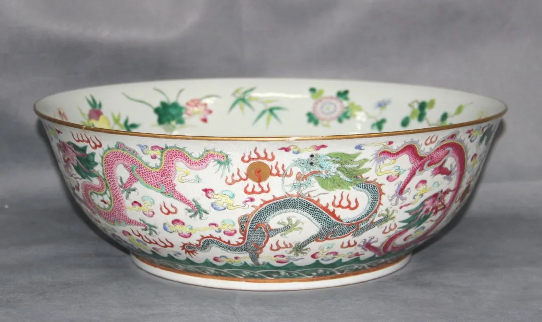 瓷碗微撇口,深弧腹,矮圈足。胎体较薄,胎质洁白坚细;釉面莹白光亮。内壁口沿装饰梅、兰、竹、菊、牵牛、玉兰、秋葵、石榴等祥瑞花果,底心绘赤龙戏珠,周身围绕流云、火焰、底部泛起海水波涛。外壁用轧道工艺绘制海水暗纹,用粉彩绘九龙腾云踏浪,相互追逐,上下呼应,颇具翻江倒海之势。轧道工艺始见于乾隆朝,是在色地上以铁锥划出纹样,颇为费工,至清晚期粉彩瓷上亦为流行。底款红彩楷书“大清光绪年制”。