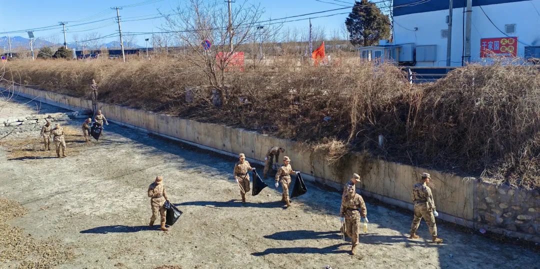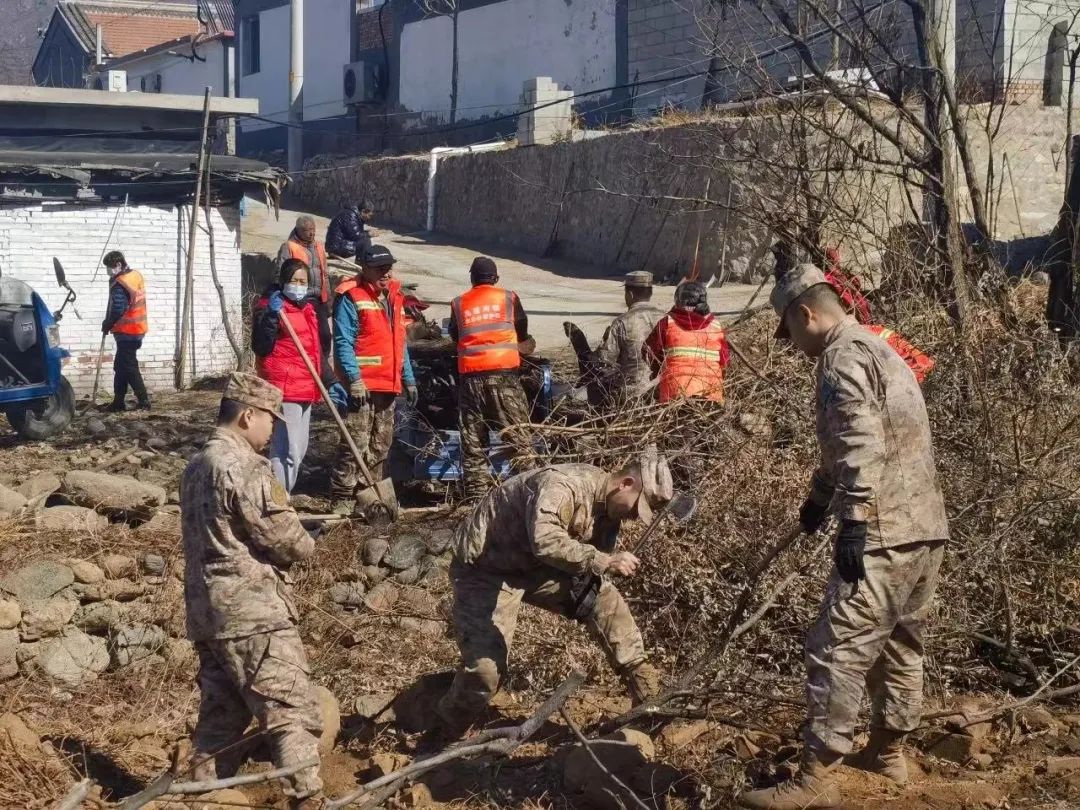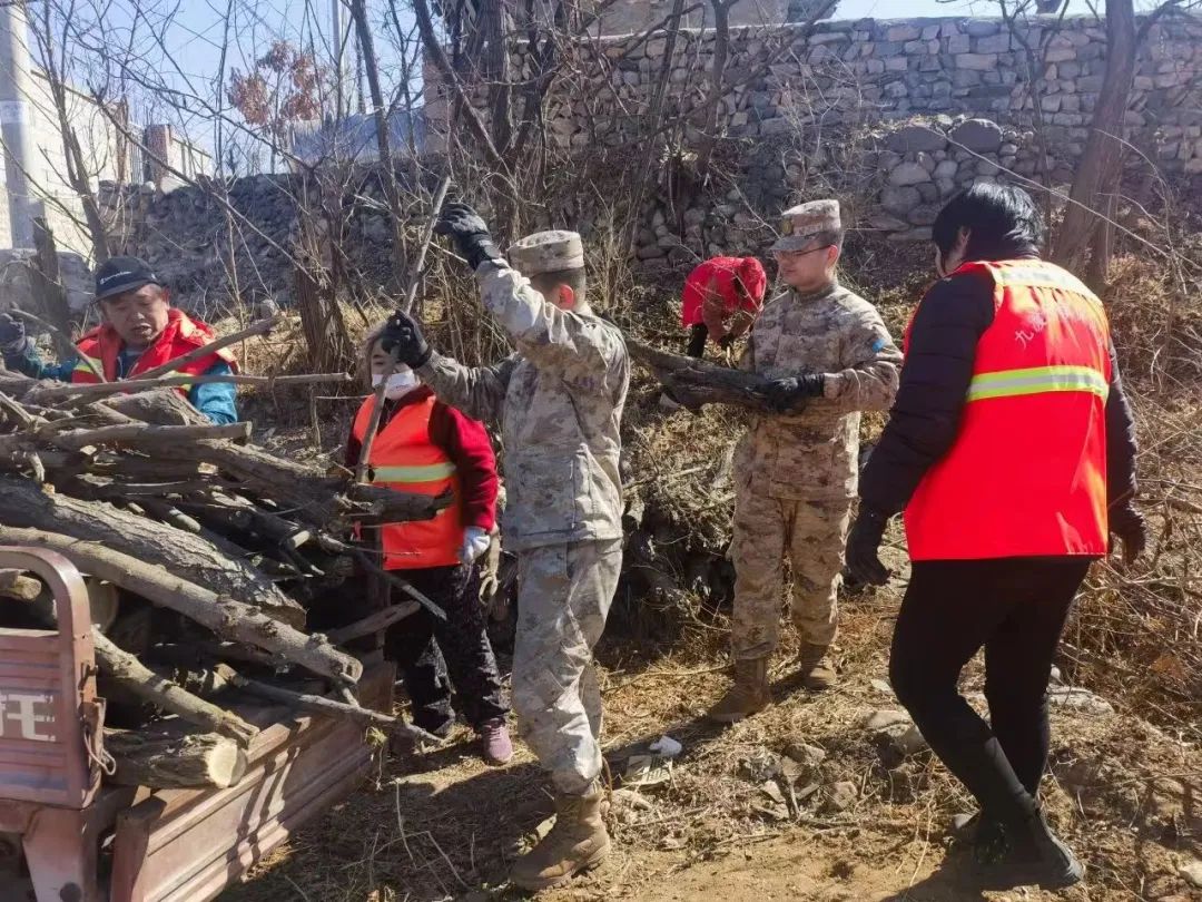 某部队联合九渡河镇黄花镇村,军民携手,以街边、村边、路边为重点,共同开展新春人居环境整治活动。官兵深入乡村,帮助村民打扫后院石堆碎片、砍伐枯树、清理道路杂物等改善居住环境。同时也为村民普及安全知识,提高村民的自我防护意识。
