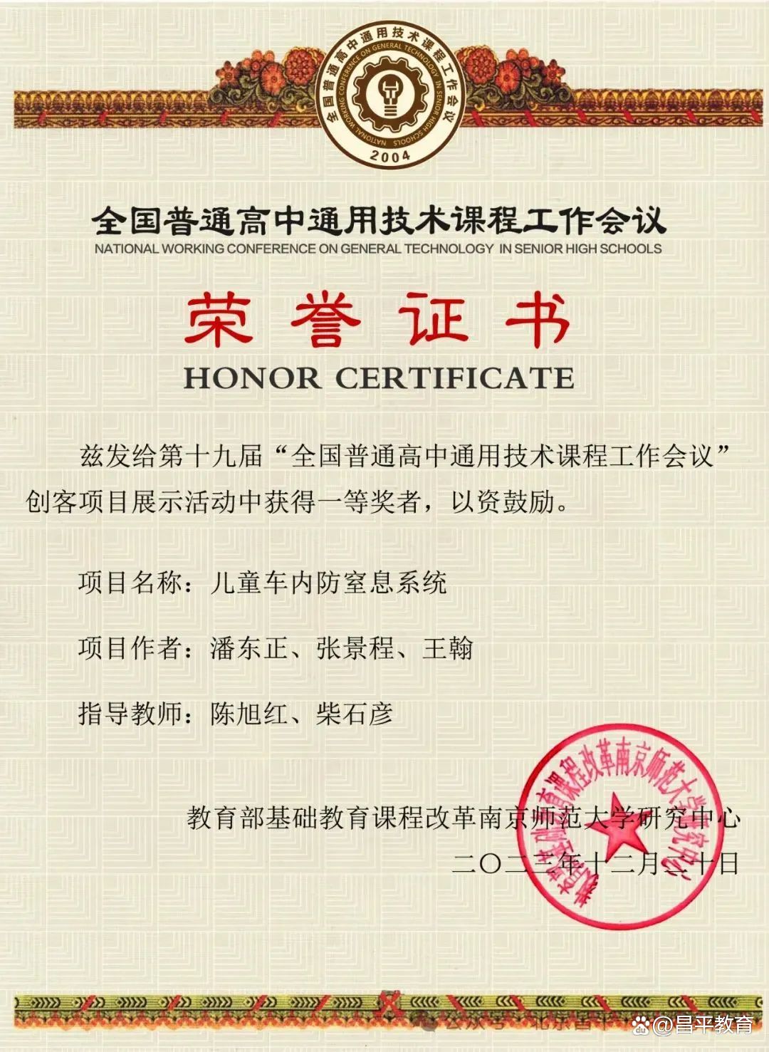 在第十九届“全国普通高中通用技术课程工作会议”创客项目展示活动中,昌平一中潘东正、张景程、王翰荣获一等奖!