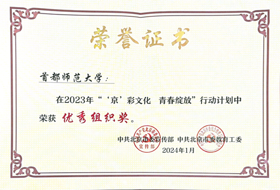 近日,首都师范大学在2023年“‘京’彩文化,青春绽放”行动计划中荣获优秀组织奖。“‘京’彩文化,青春绽放”行动计划由北京市委宣传部、市委教育工委主办,旨在推动首都高校人才培养和全国文化中心建设双向互动、相互赋能。计划包括6大机制、14个具体项目。作为首批试点高校之一,首都师范大学承担其中信仰行、红色行、古都行、文艺行、志愿行5个机制下的13个具体项目,是承担项目最多的高校之一。