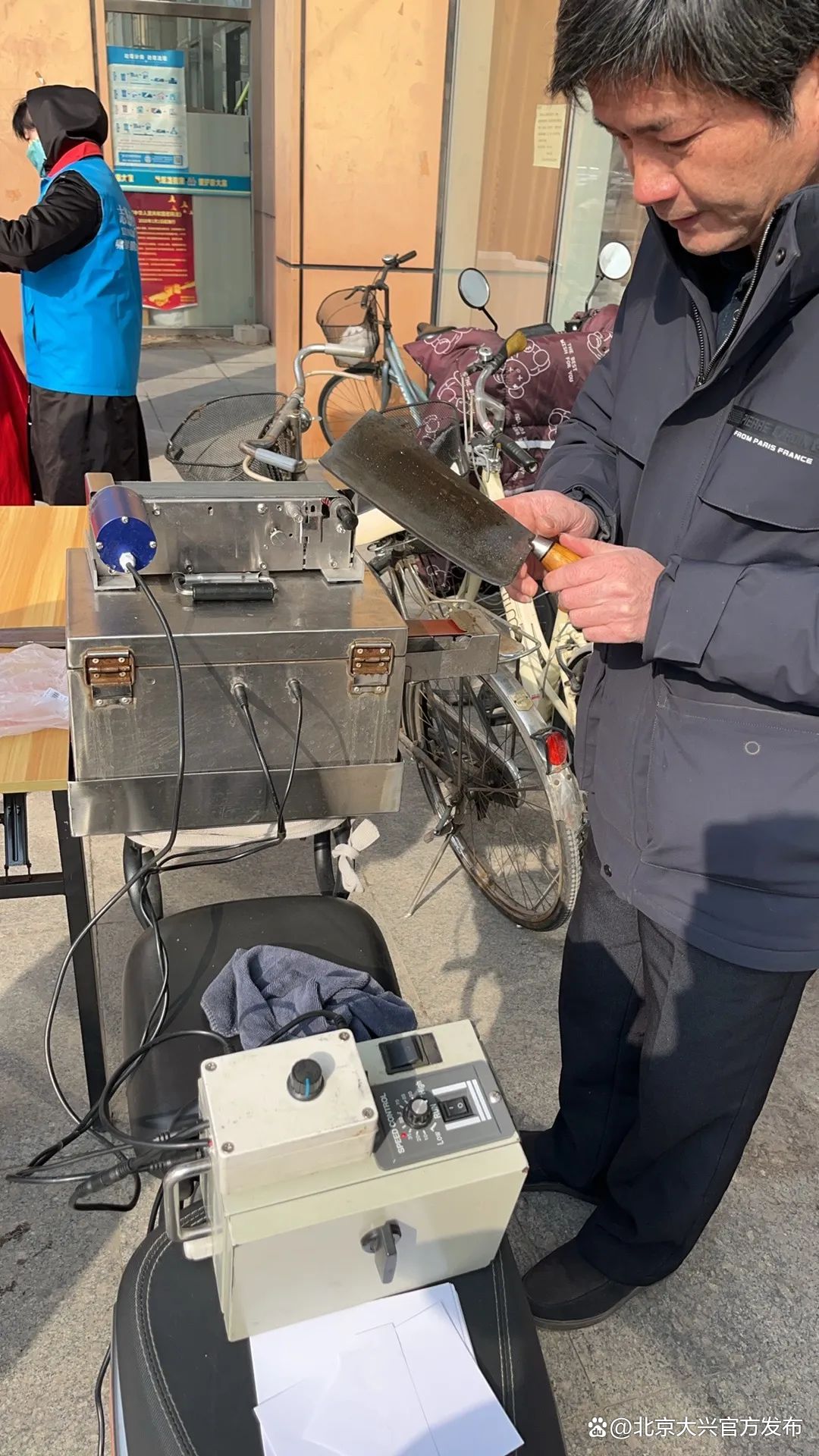 磨剪子师傅仔细打磨居民送来的刀具,动作老练迅速、连贯性极强。这样贴近居民生活的服务深受居民欢迎,大家纷纷夸赞师傅的手艺棒极了。