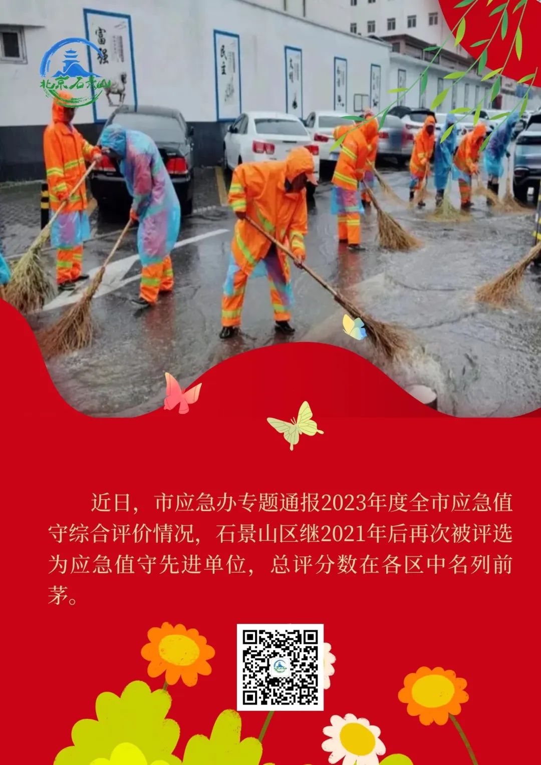 近日,市应急办专题通报2023年度全市应急值守综合评价情况,石景山区继2021年后再次被评选为应急值守先进单位,总评分数在各区中名列前茅。