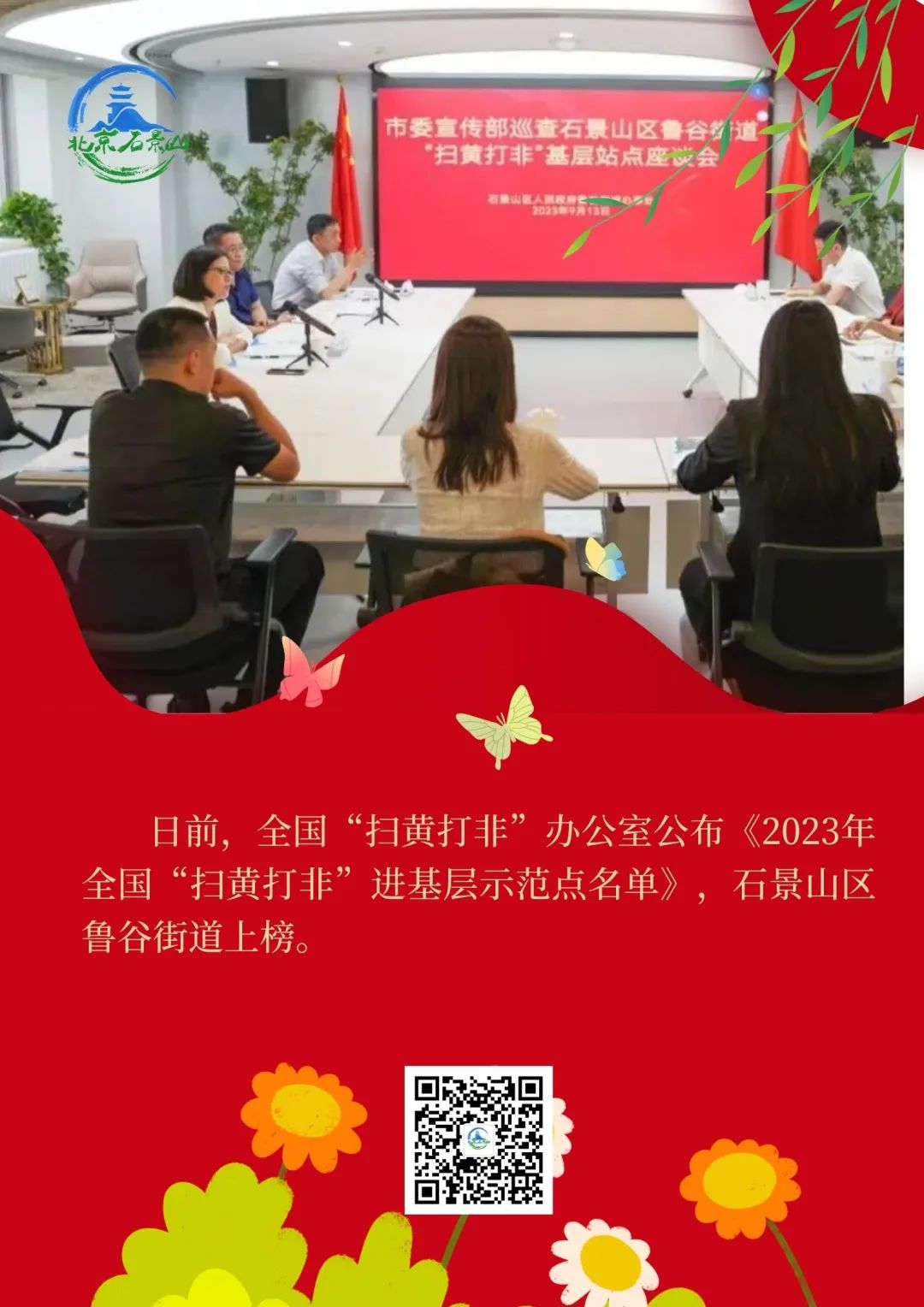 1月31日,全国“扫黄打非”办公室公布《2023年全国“扫黄打非”进基层示范点名单》。其中,石景山区鲁谷街道上榜。鲁谷街道、金顶街街道、古城街道和区未成年人互动教育中心等4家基层站点历经层层选拔,从全市35家参评单位中脱颖而出,获评北京市2023年度“扫黄打非”进基层示范点。在全市4家获评国家级示范点单位中,鲁谷街道占有一席,同时荣获全国“扫黄打非”进基层示范点。