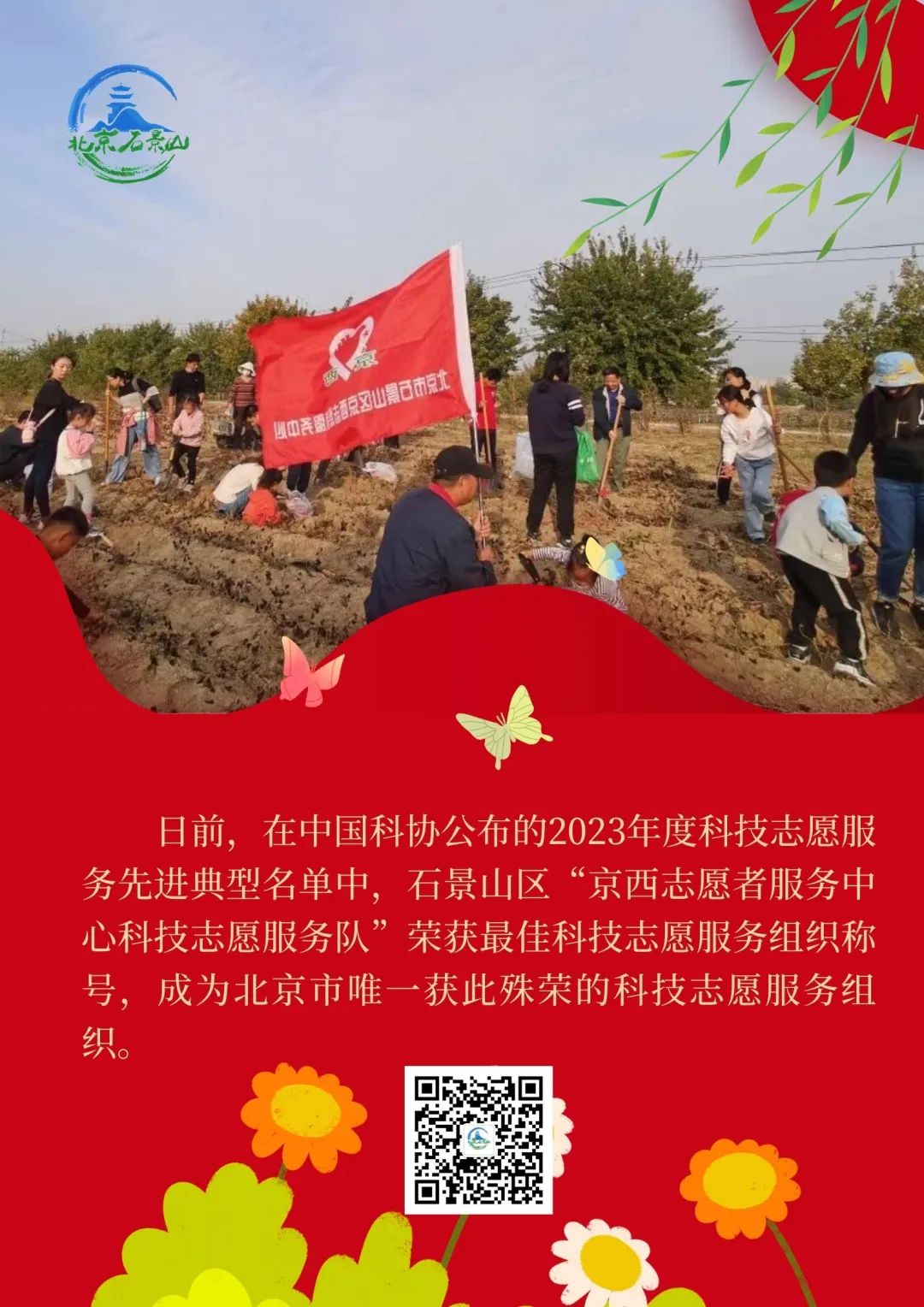 1月,在中国科协刚刚公布的2023年度科技志愿服务先进典型名单中,石景山区“京西志愿者服务中心科技志愿服务队”荣获最佳科技志愿服务组织称号,被选树为中国科协科技志愿服务先进典型,成为北京市唯一获此殊荣的科技志愿服务组织。
