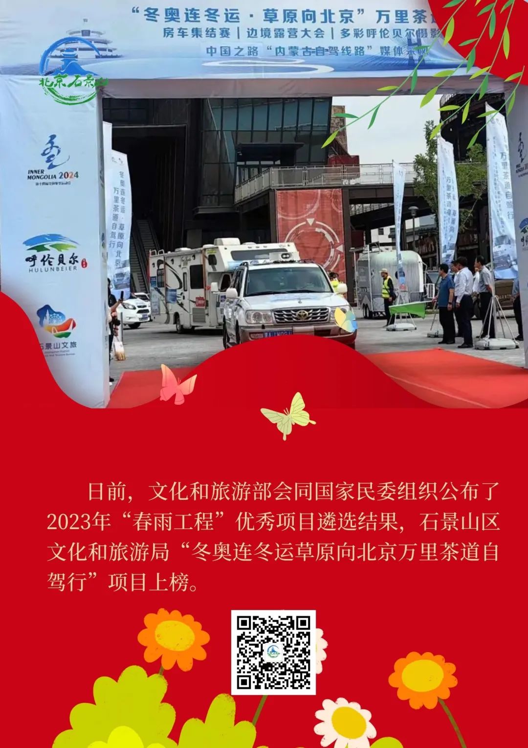 日前,为推广各地各单位创新实施“春雨工程”成效,文化和旅游部会同国家民委组织公布了2023年“春雨工程”优秀项目遴选结果,石景山区文化和旅游局“冬奥连冬运草原向北京万里茶道自驾行”项目上榜。该项目的实施进一步推动了石景山区与内蒙古等地的文化旅游交流与合作,深化地区间的互动与友谊,促进石景山区跨区域协作创新发展。