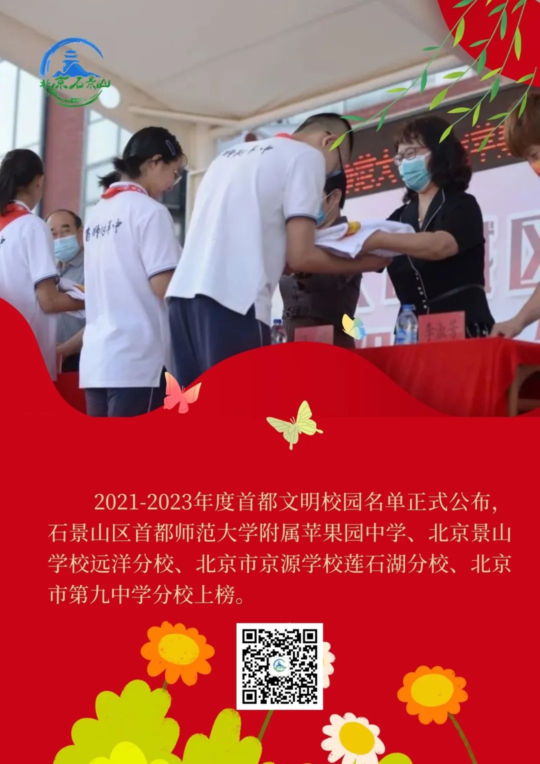 近日,2021-2023年度首都文明校园名单正式公布,北京小学、北京市第五中学、中国传媒大学附属中学等113所学校入选。石景山区首都师范大学附属苹果园中学、北京景山学校远洋分校、北京市京源学校莲石湖分校、北京市第九中学分校上榜。