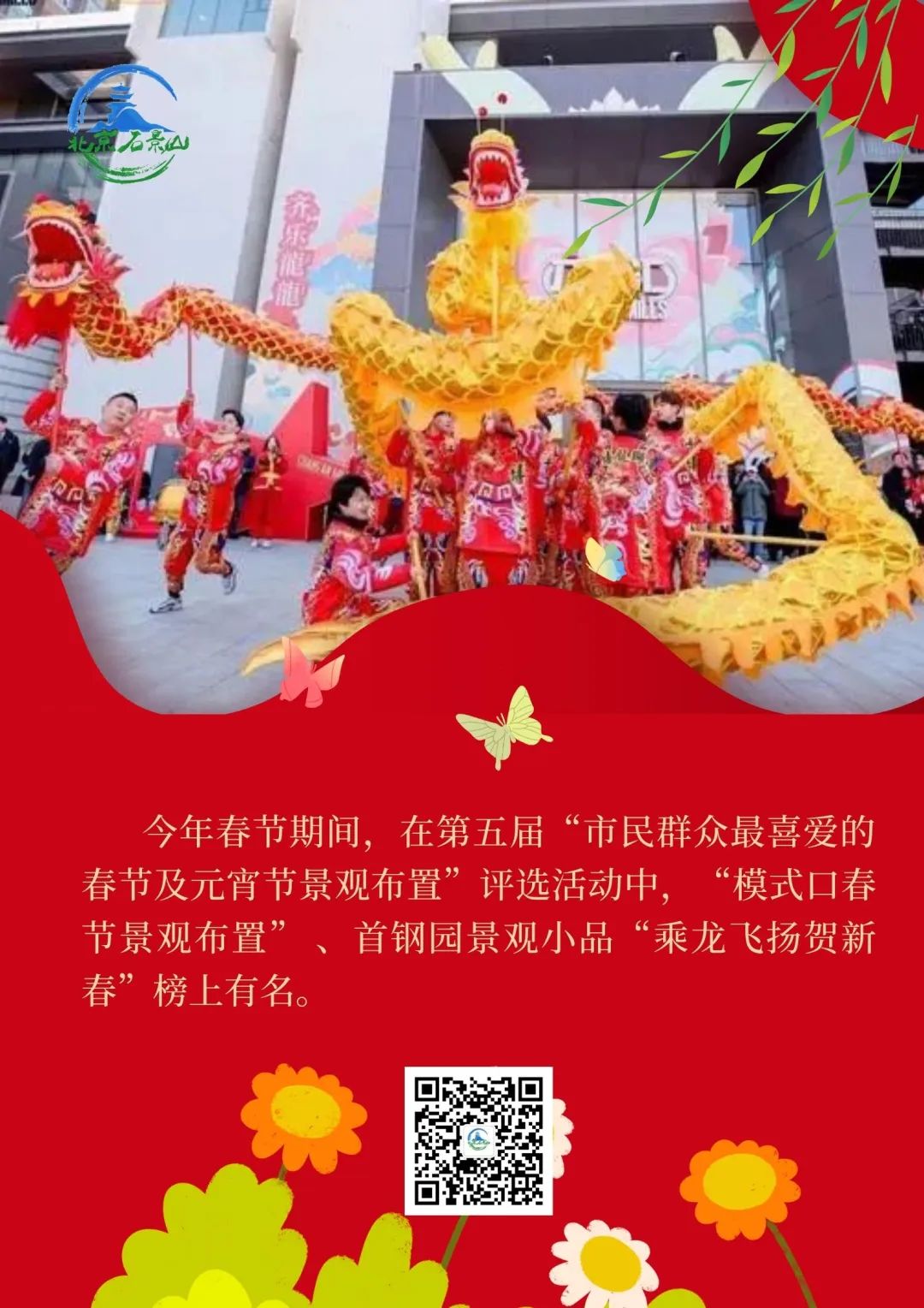 今年春节期间,北京市委宣传部、北京市城市管理委员会联合北京日报社推出第五届“市民群众最喜爱的春节及元宵节景观布置”评选活动,精选出景观小品、灯光秀以及家门口“小而美”的节日景观等共计24处春节景观布置打卡点,邀请市民为心仪的景观布置投票点赞。其中,“模式口春节景观布置” 、首钢园景观小品“乘龙飞扬贺新春”榜上有名。