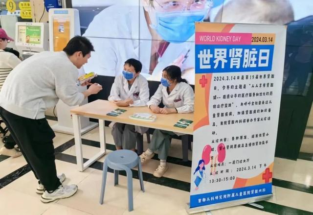 下午在门诊楼一层,“世界肾脏病日”的宣传标语鲜艳醒目,肾脏内科开展了线下义诊咨询活动,内容包括:各种原发、继发肾小球、肾小管间质病及急慢性肾功能不全。活动吸引了众多患儿家长,医生们围绕着儿童遗尿、泌尿系感染、肾积水、肾病综合征等问题耐心进行了解答,给出了诊断治疗方面的建设性意见,家长们表示获益很大。